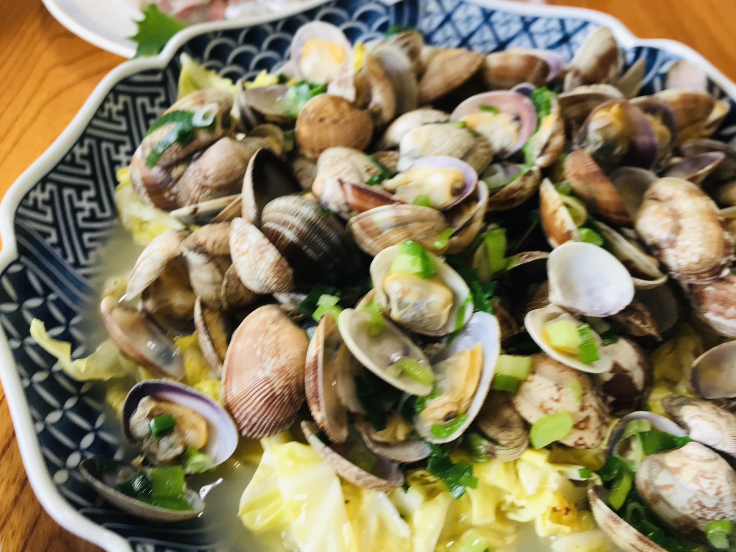 浅見作のあさりの酒蒸し(ちょっとブレててすみません)。ちらしたネギ、下に敷かれたキャベツで見栄えも美しい!