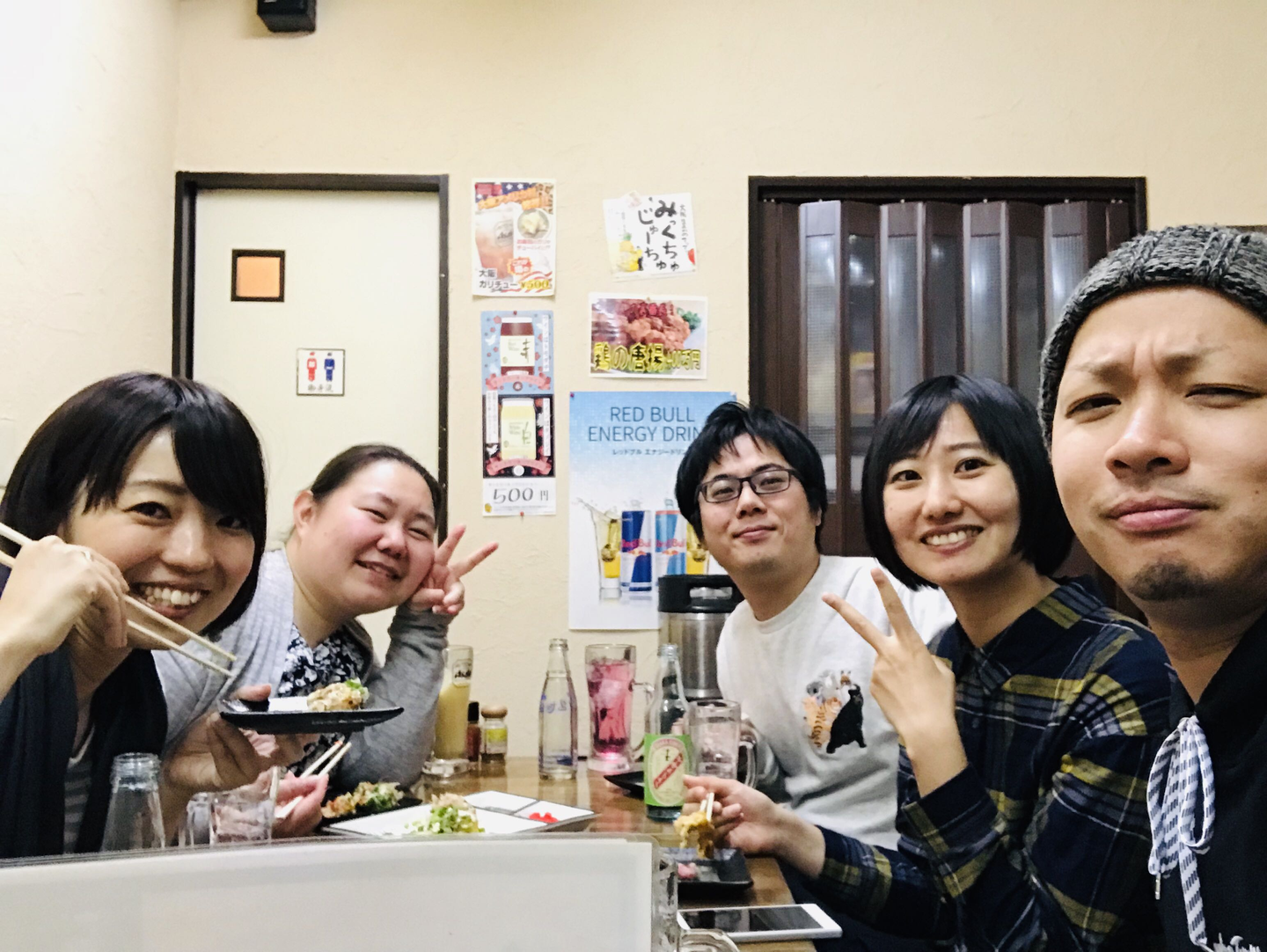部長の植松(中央)が「ここのたこ焼きうまいっすよ」と太鼓判を押す浅草ひさご通りの「たこ焼居酒屋 taco.44」で休憩。