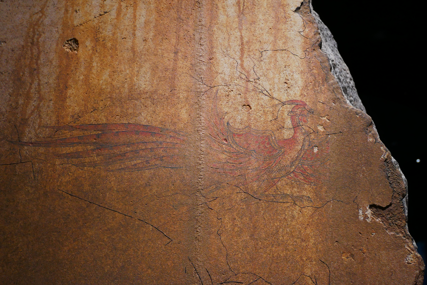 7世紀末から8世紀初め頃に造られたキトラ古墳。フミが撮影した南壁に描かれた「朱雀」のレプリカ。