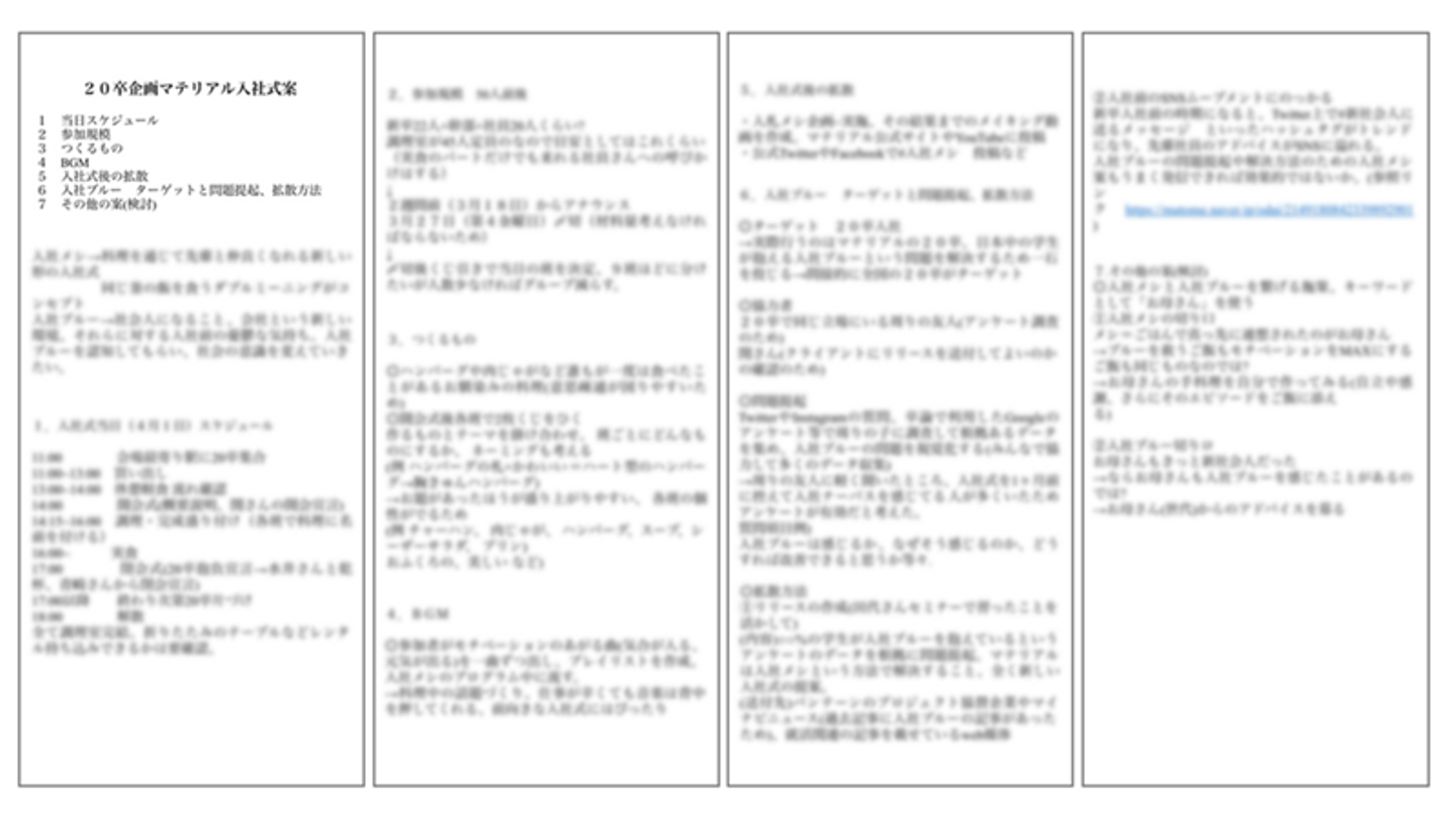 これは、実際にインターン生が作成した「#入社メシ」実施計画書の一部です。当日のプログラムや作る料理だけでなく、入社式に関わる問題喚起や話題拡散方法など、社長プレの段階よりもさらに細かく、よりPR視点でプランニングされています。