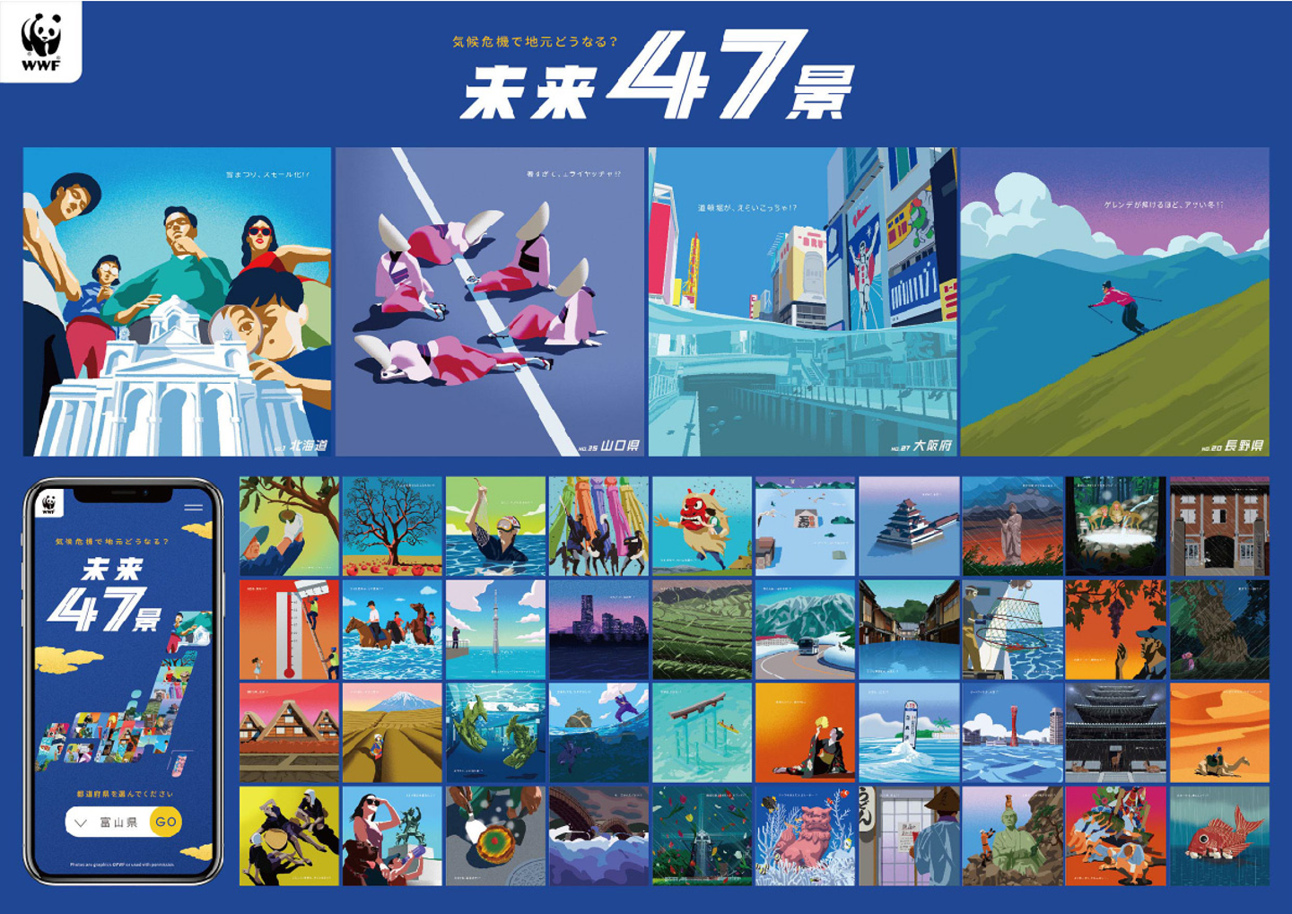 私たちの日々の生活にも様々な影響を及ぼしている気候危機に対して、より多くの人がこの危機に対して目を向けて、自分ゴト化してもらうため、あなたの地元に訪れるかもしれない気候危機を都道府県別に描いた「未来47景」を公開。トップページで都道府県名を選択すると、その地域の未来の気候危機をイメージさせるイラストと解説が表示され、一人ひとりにできる具体的な行動を知ることができる。