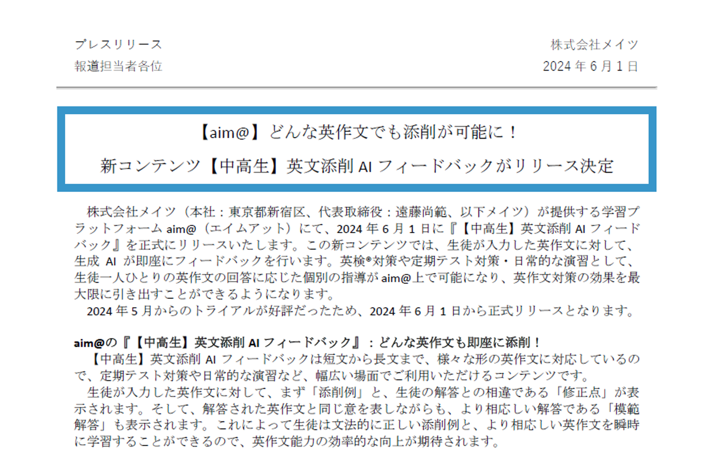 株式会社メイツ(本社:東京都新宿区、代表取締役:遠藤尚範、以下メイツ)が提供する学習プラットフォームaim@(エイムアット)にて、2024年6月1日に『【中高生】英文添削AIフィードバック』を正式にリリースいたします。この新コンテンツでは、生徒が入力した英作文に対して生成AIが即座にフィードバックを行います。英検®対策や定期テスト対策・日常的な演習として、生徒一人ひとりの英作文の回答に応じた個別の指導がaim@上で可能になり、英作文対策の効果を最大限に引き出すことができるようになります。 2024年5月からのトライアルが好評だったため、2024年6月1日から正式リリースとなります。