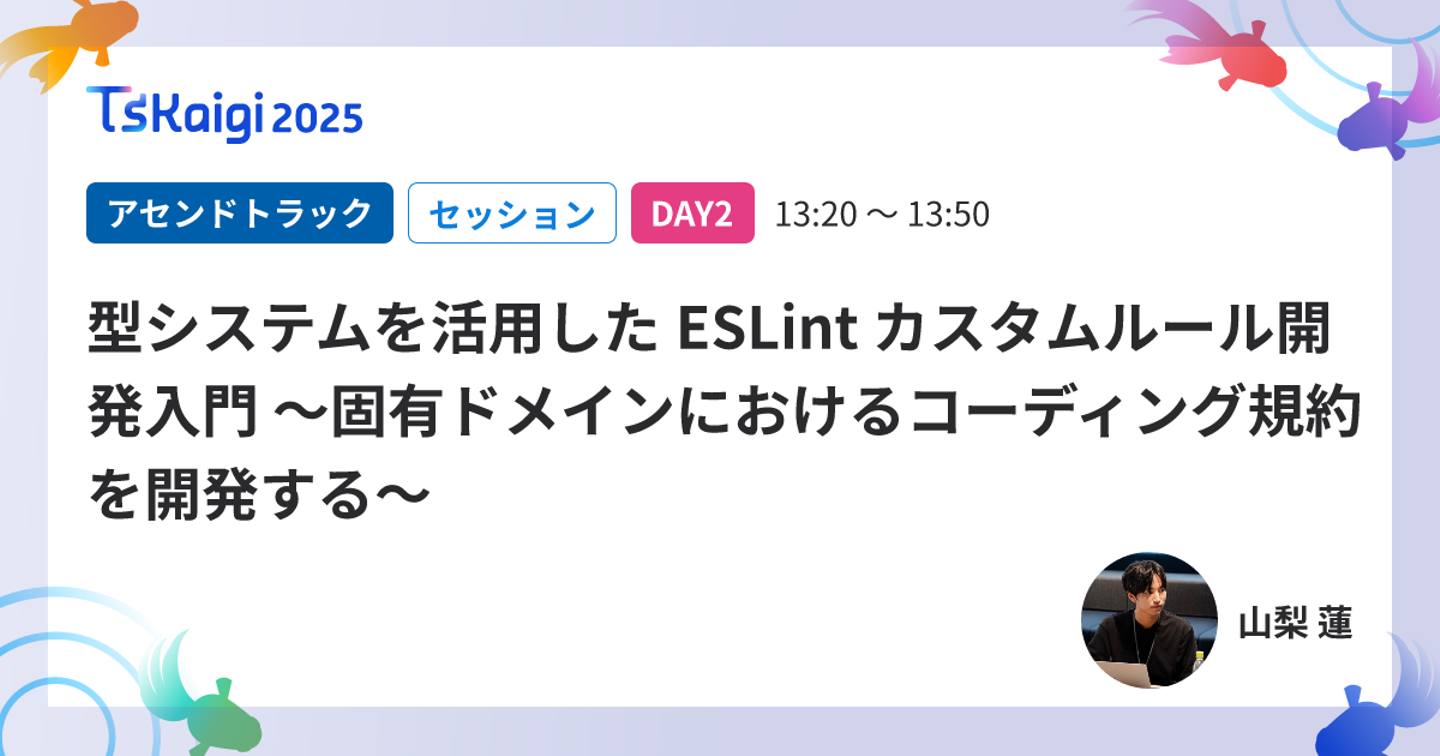 (セッション)型システムを活用した ESLint カスタムルール開発入門 〜固有ドメインにおけるコーディング規約を開発する〜 / 山梨 蓮さん