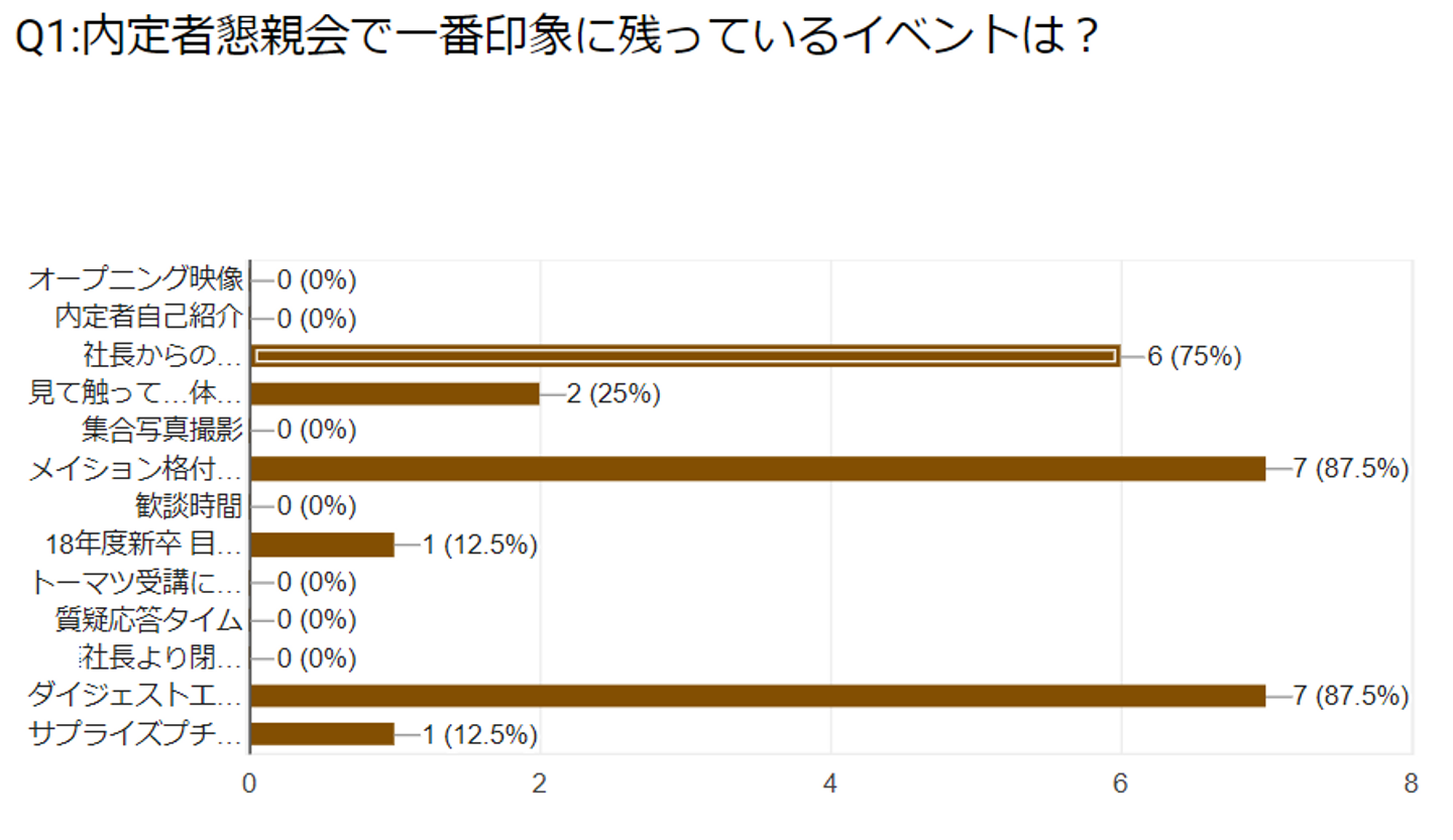 チョコレートの食べ比べ対決では、ゲームを通じて内定者同士のつながりを深める、また先輩社員や社長も交えて行うことでコミュニケーションを図ることを意図としています。懇親会で参加者に一番行ってほしいことをゲームとして実施。その結果、このイベントがもっとも印象づいたというのは、懇親会を開催した意味がおおいにあったと言えるでしょう。