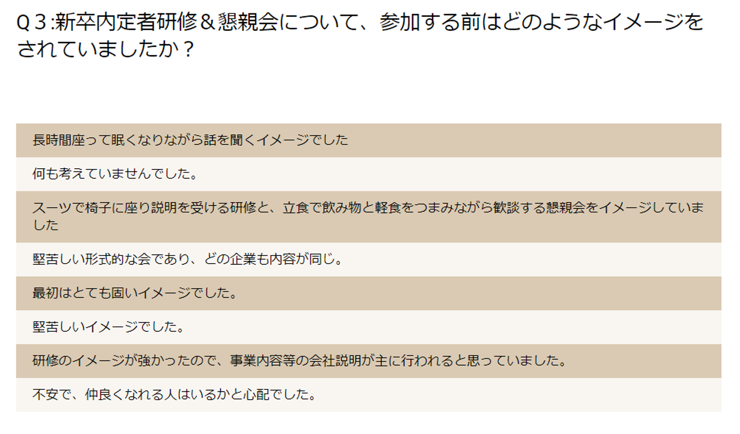 長い話を聞かなければならない、堅苦しいイメージなど、「内定者が積極的に参加をしたいと感じていない」ことが伝わります。