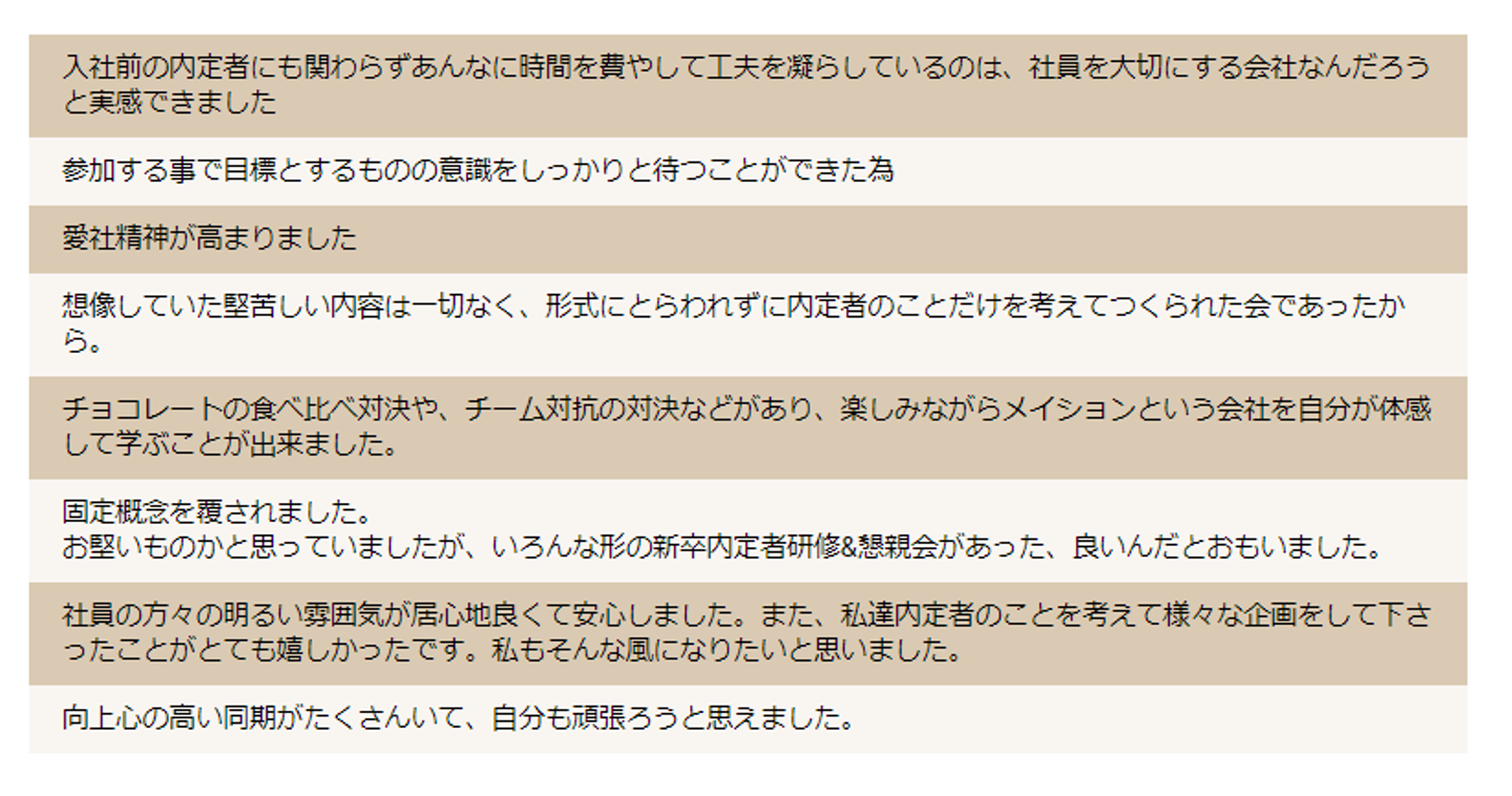 ですが、この会社に入社してよかった、これから頑張ろうというモチベーションを高めてもらうため誠心誠意行ったことは、内定者にもしっかりと伝わり、良い結果を導きだせたことが上記の声より見えてきます。