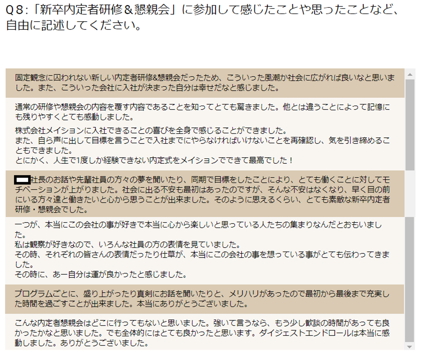 「感動をした」、「想像していた内定式とは違った」など、感動と驚きを実感してもらうことができたことがアンケートから読み取ることができます。