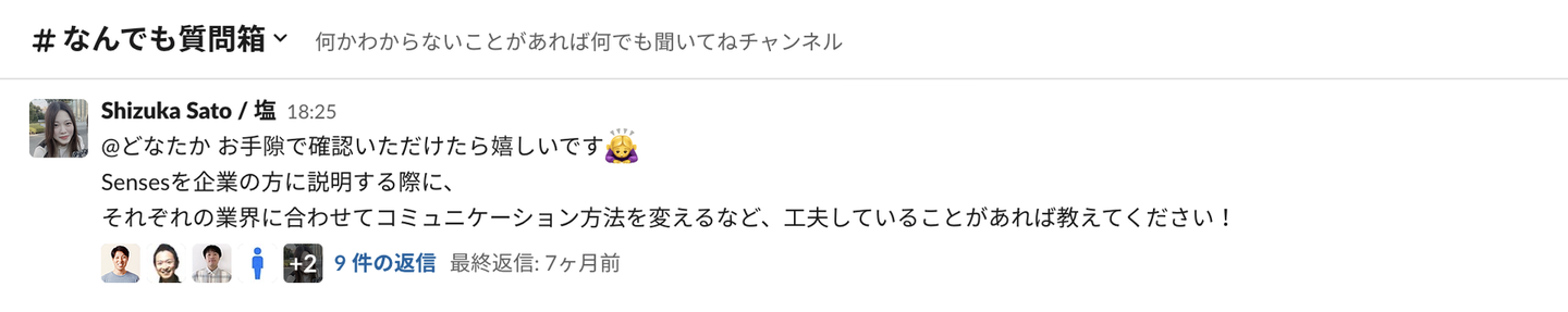 Slackに質問用のチャンネルがあって、そこで質問するといろんなチームの人が回答してくれるので、特に入社直後はとても助かりましたね。