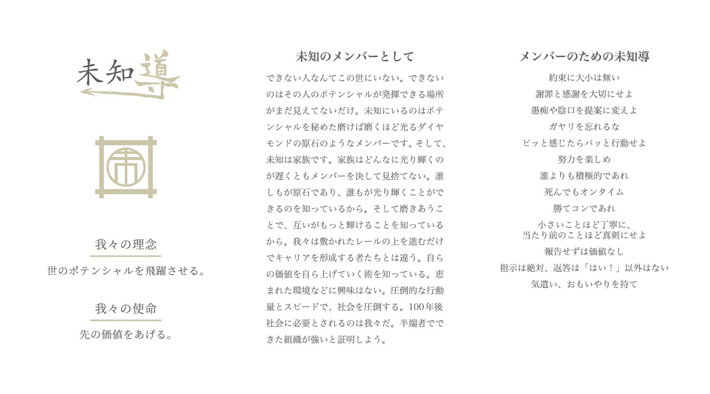 ※ポテンシャル視点での採用を日本で当たり前に(人柄重視の採用)を目指すためのロールモデルを未知がまず行っていきます