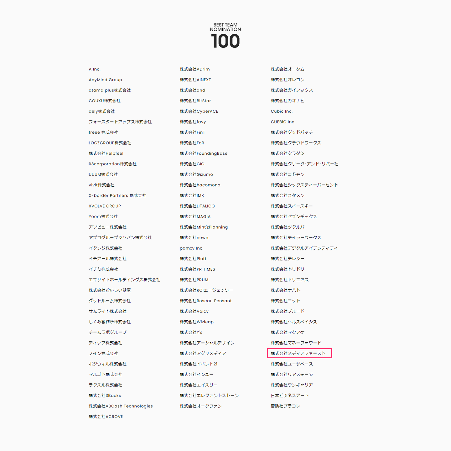 約43,000社の中からBEST100社に選出