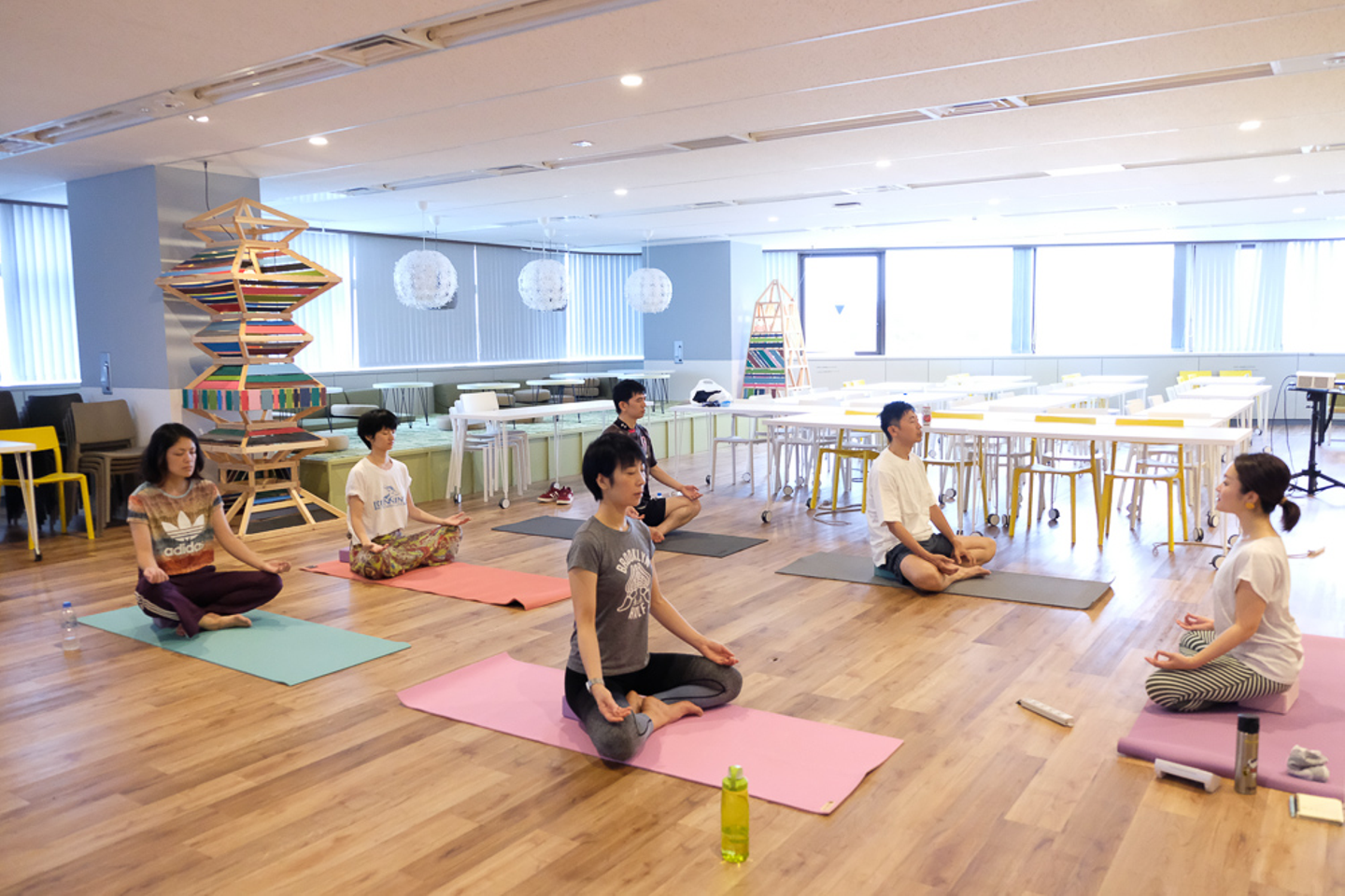 毎月、始業前の「朝ヨガ(40~60分程度のショートクラス)」と終業後の「夜ヨガ(70~90分程度のロングクラス)」を各2回ずつ、計4回ほど行っています。