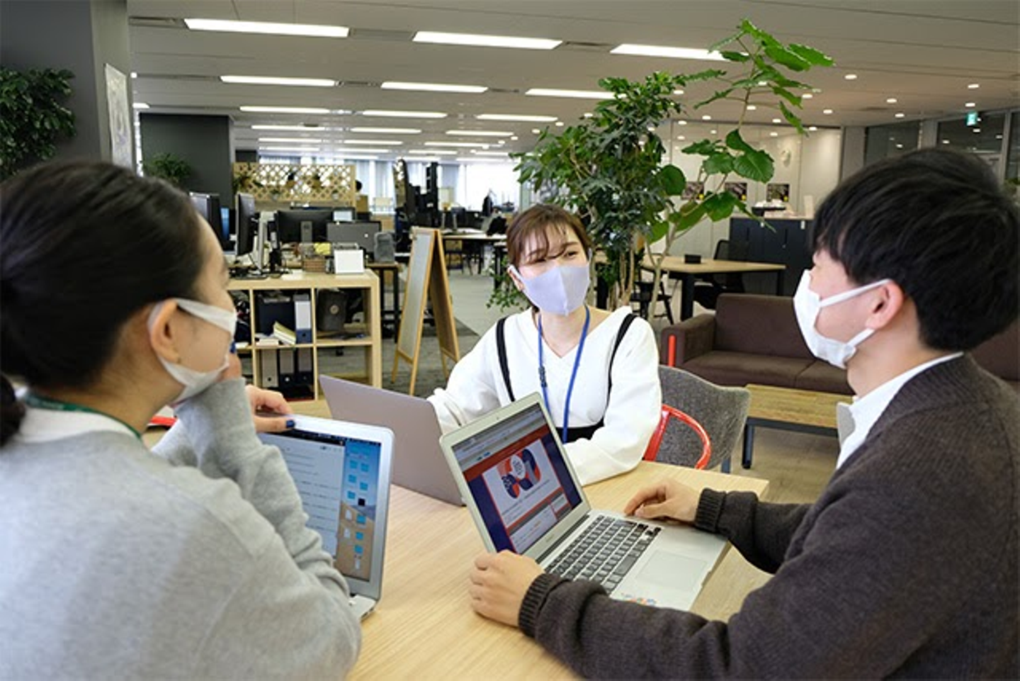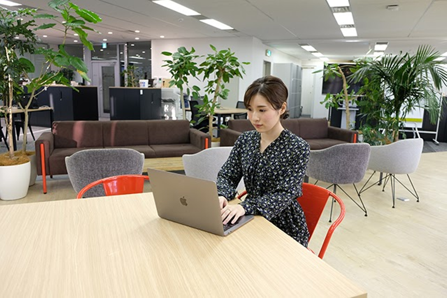 出社の時は、午前中に会社に着き、4階や6階でお仕事を開始します。IBGのオフィスはフリーアドレスなので、固定席がなく、その日の気分に合わせて好きな場所で仕事をすることができます。最初は緊張もあり、隅の方でちんまりと作業をしていたのですが、最近は慣れてきて自分のお気に入りスペースを見つけられるようになりました。赤や黄色のポップなカラーに加え、観葉植物の緑が鮮やかなオフィスは開放的でとても働きやすいです! 作業の合間に編集部の方々や他部署の社員のみなさんとお話しできるのも楽しみの一つ。リモートワークの家ならではの居心地の良さはありますが、オフィスで様々な人と関わりながらお仕事をするのもやはり楽しくて刺激的だなと実感しています。