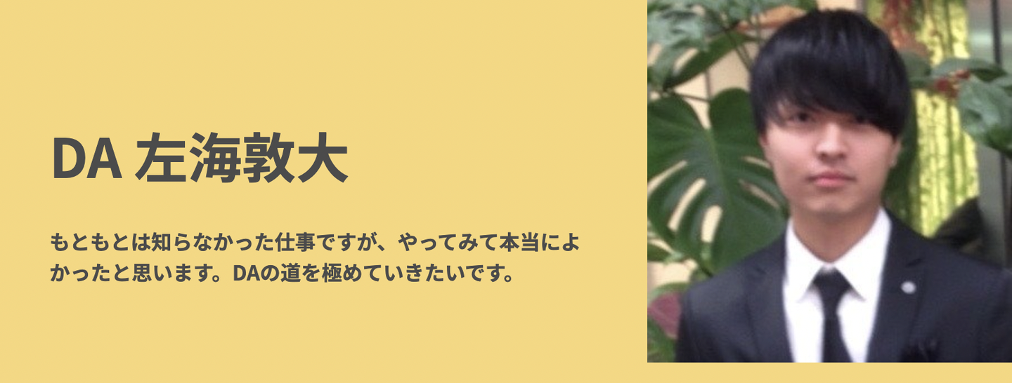 DA 左海敦大もともとは知らなかった仕事ですが、やってみて本当によかったと思います。DAの道を極めていきたいです。