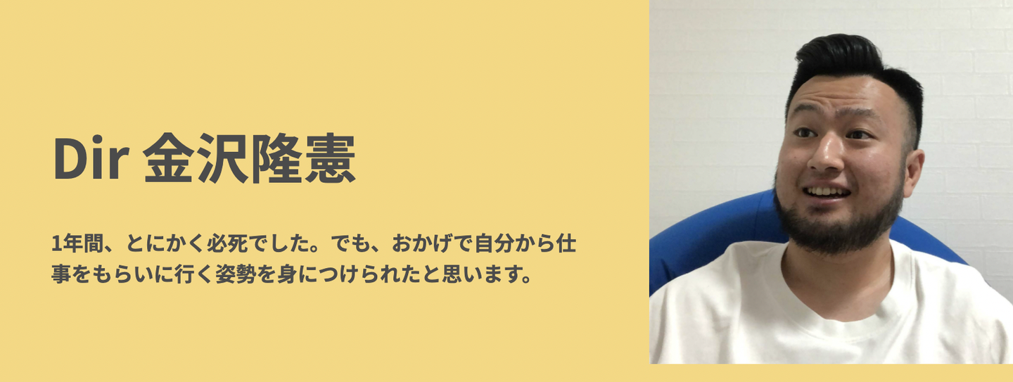 トップバッターはディレクター(Dir)の金沢 隆憲(かなざわ りゅうけん)とデータアナリスト(DA)の左海 敦大(さかい あつひろ)。ビジネス職2名の成長記録をご覧ください。