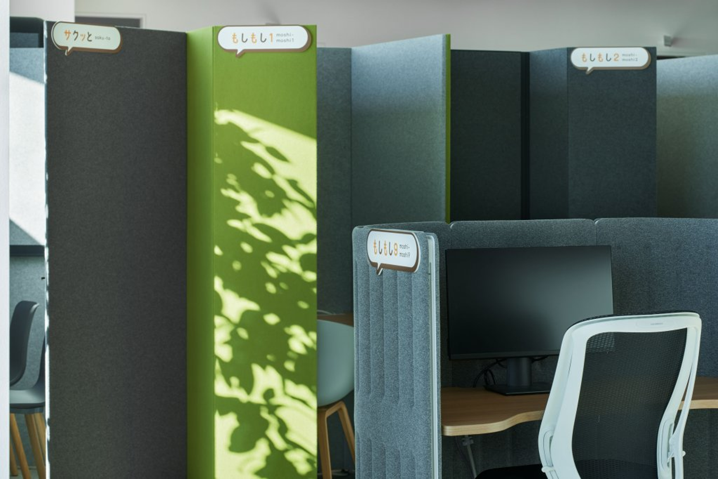 オフィス内の多くがオープンスペースとなり、部署の垣根を超えたコミュニケーションが叶う一方で、集中して個人ワークに没頭したい時も。こちらの「ひそひそ」エリアには、周囲の視線を遮断できるブースが多数設置されています。