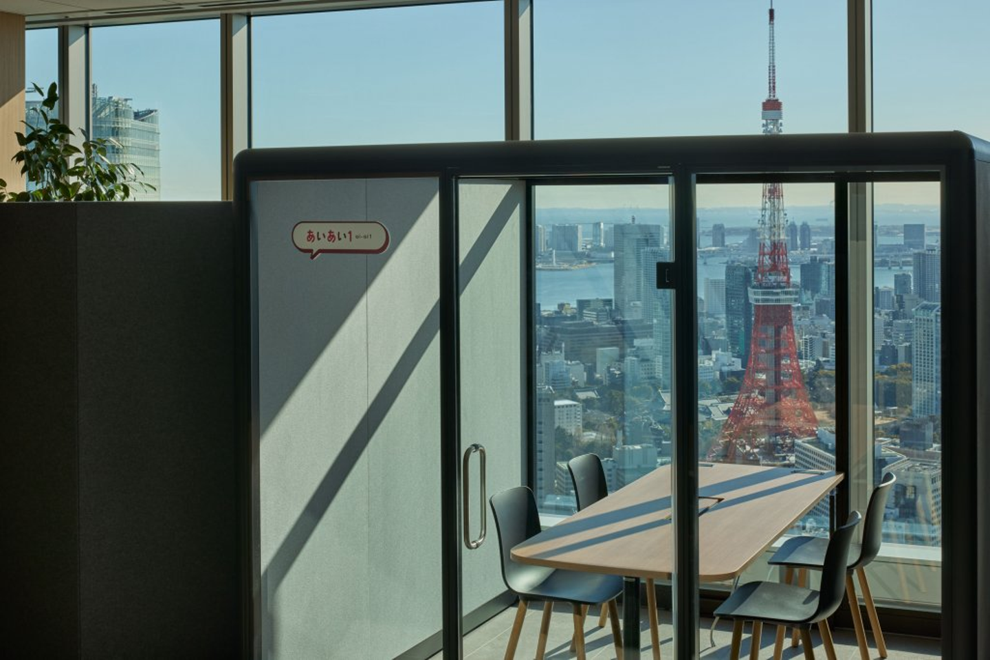 ミーティングスペースからは、東京タワーやお台場の景色が一望できます。仕切りをあえてスケルトンにすることで、開放的な雰囲気となっています。