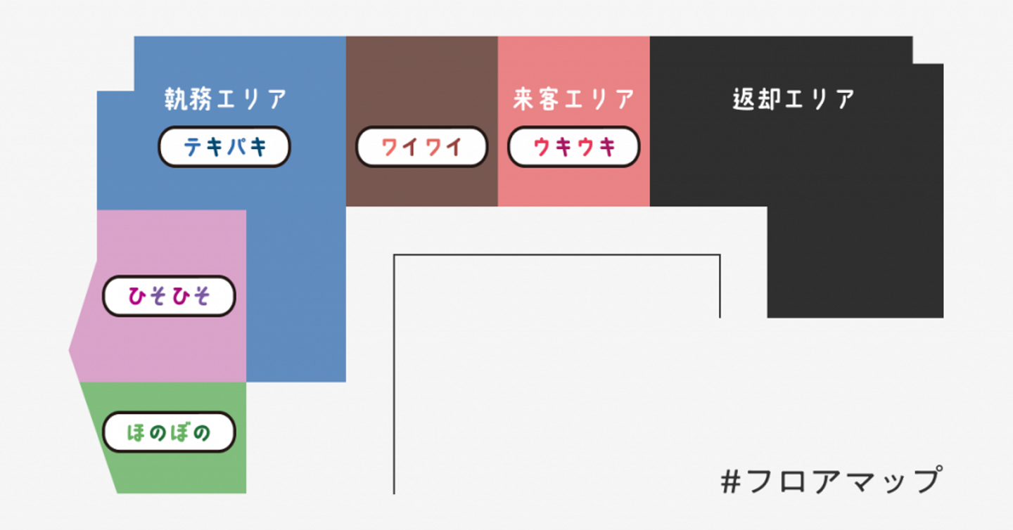 今回のオフィスリニューアルでは、出社率の低下によって過剰になってしまった一部のエリアを返却。オフィスは縮小されましたが、フロアを5つにゾーニング(ウキウキ、ワイワイ、テキパキ、ひそひそ、ほのぼの)し、社員それぞれの利用目的に合わせたオフィスの使い方が可能となっています。それでは、それぞれのエリアに隠されたこだわりを見ていきましょう。