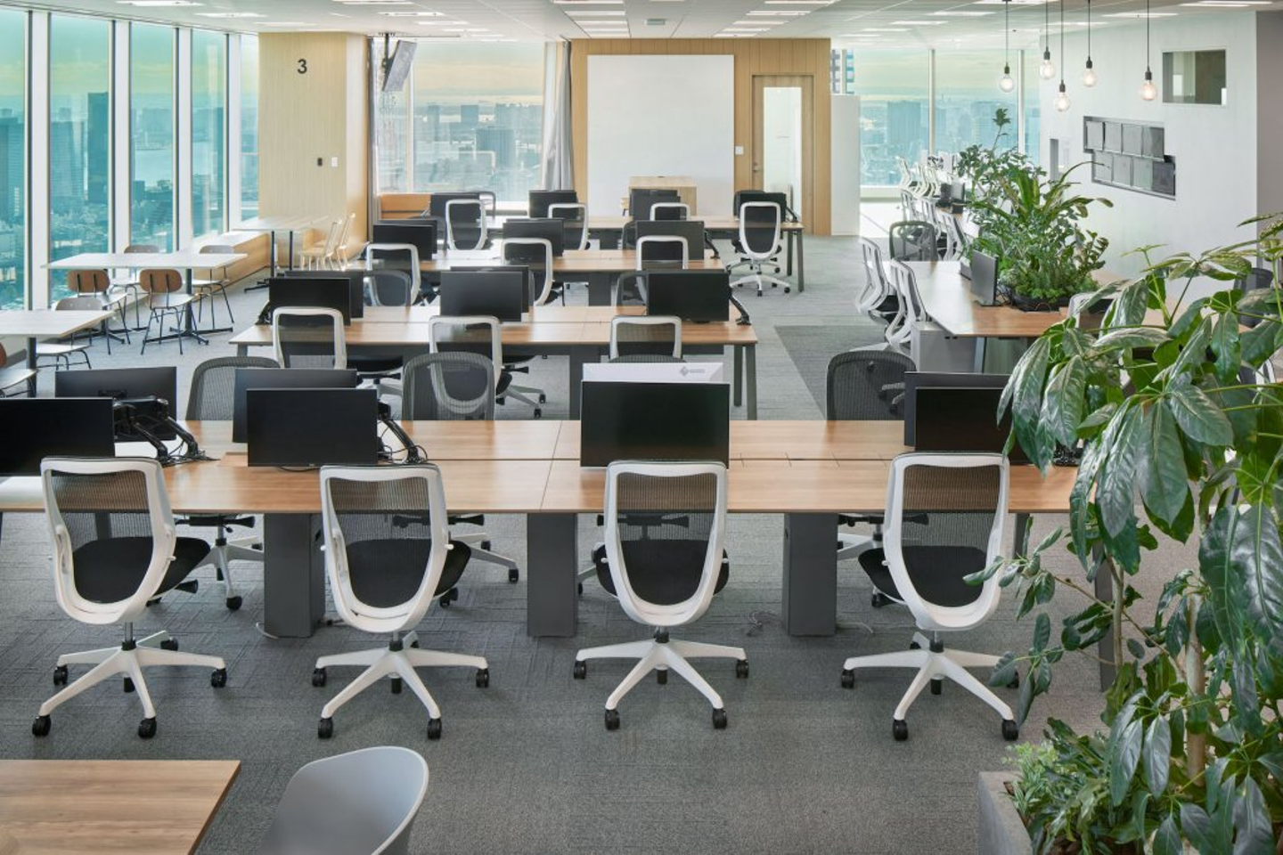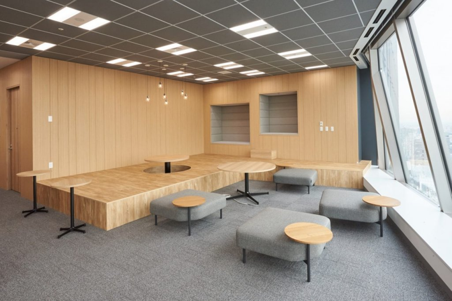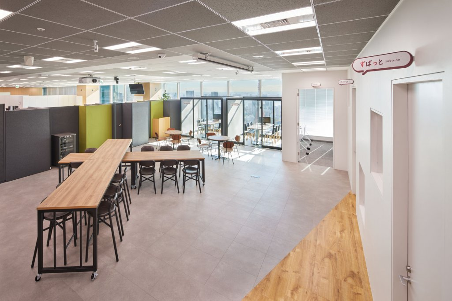 「ウキウキ」エリアで見られた開放感あふれる絶景は、ここ「テキパキ」エリアでも味わえます。ラフな打ち合わせやアイデア出しだけでなく、ランチ会などにも使える多目的な空間です。