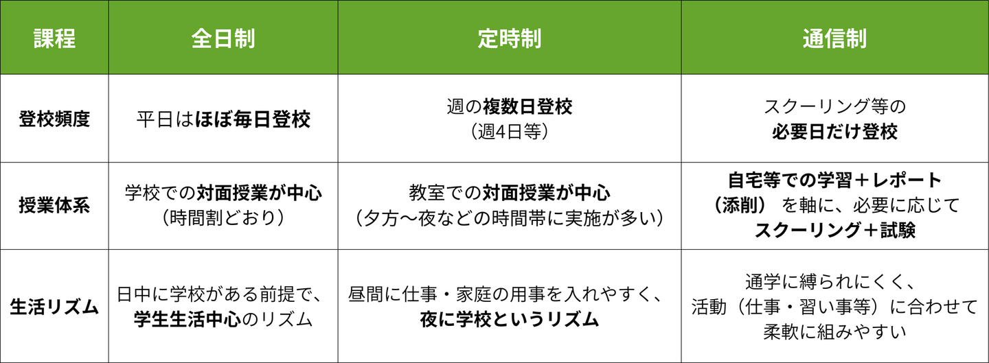 ・定時制課程(定時制):夜間や昼夜の別枠など、決まった時間帯に通う