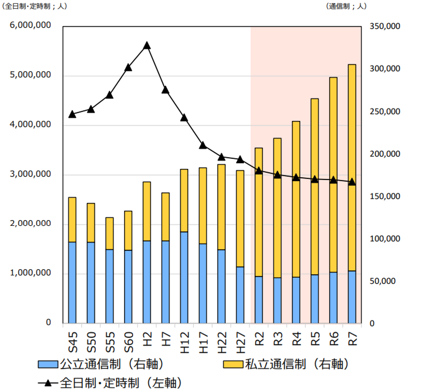 通信制高校は、進路の一つとして選ばれる機会が増えています。実際に、通信制課程の生徒数は増加傾向にあり、令和7年度には305,221人となっています。これは高校生全体のおよそ9.6%(約10人に1人)にあたります。