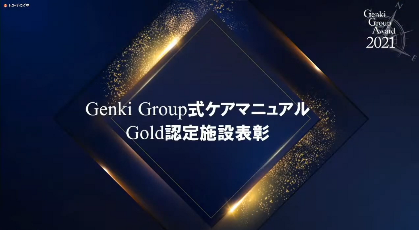 Genki Group式ケアマニュアル Gold認定施設表彰 最初の表彰項目は『 Genki Group式(以下GG式)ケアマニュアル』 表彰です。Genki Group式の介護の技術とその実践方法が記されている独自のケアマニュアル全8種の中で、今回は 『 GG式認知症ケアプログラム 』 にて高い実践度合いが認められた施設が表彰されました。 こうした表彰を通して、浸透施策の仕方やより良いケアをGenki Group全体へ波及させています。