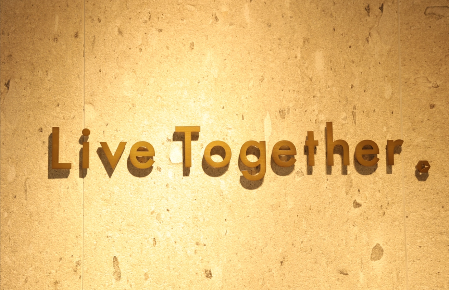 👆介護領域:社会福祉法人元気村グループの運営支援本部オフィスの壁に飾ってある「Live Together」。