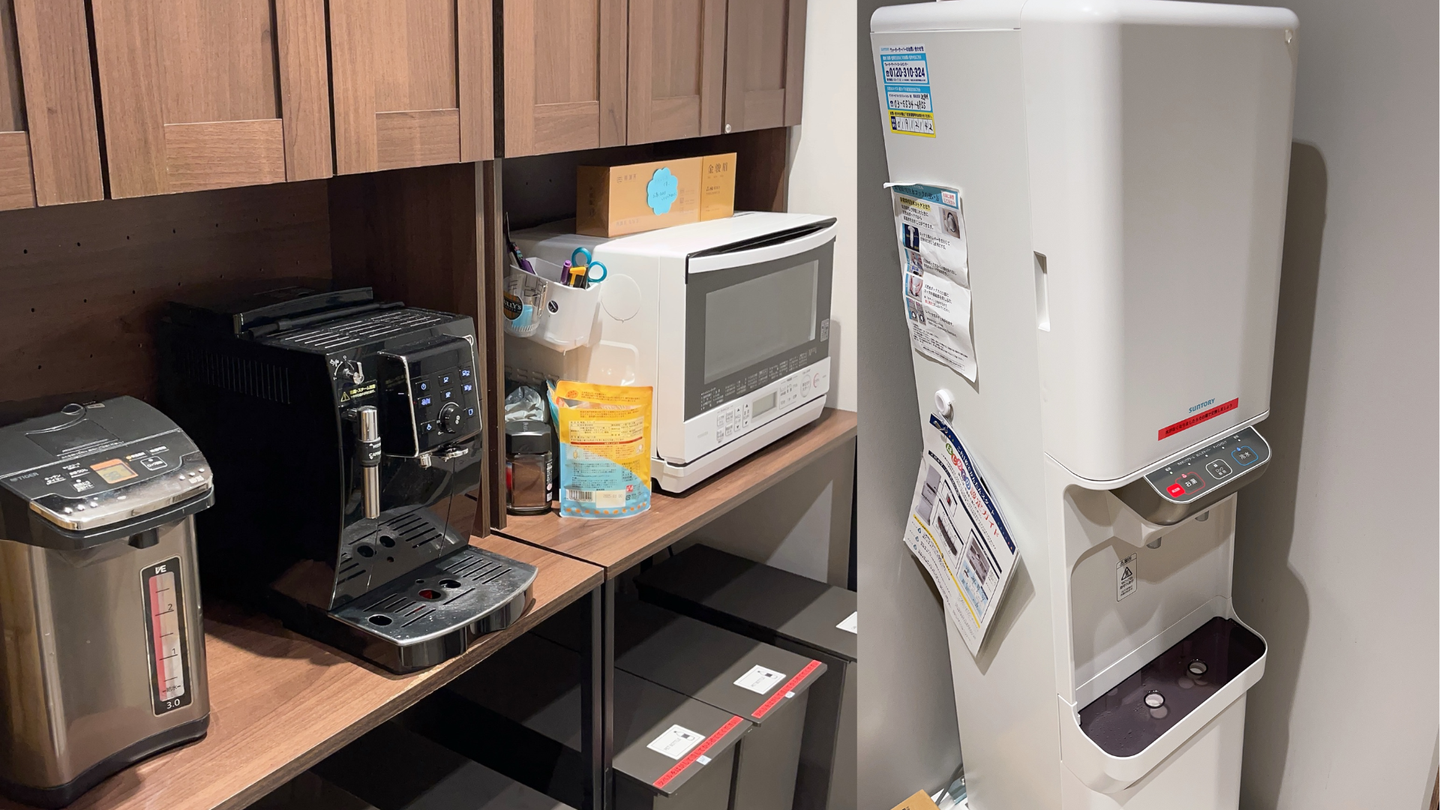 オフィスには、自由に使用できるコーヒーマシンやウォーターサーバー、そして各種ペットボトル飲料がございます!全部飲み放題なんですよ^^