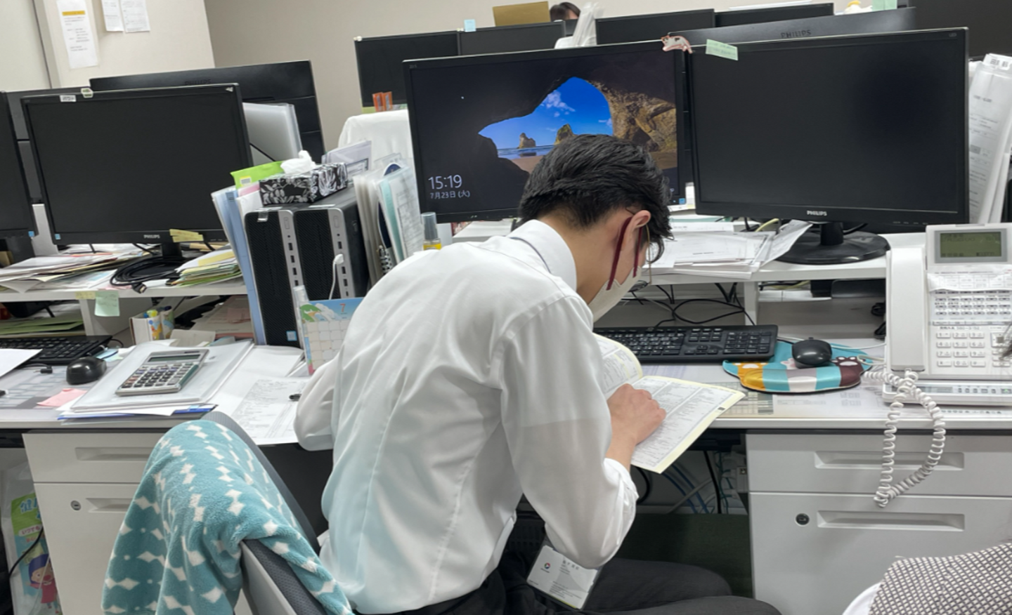 ☝医事課で診療報酬早見表とにらめっこする飯干さん。
