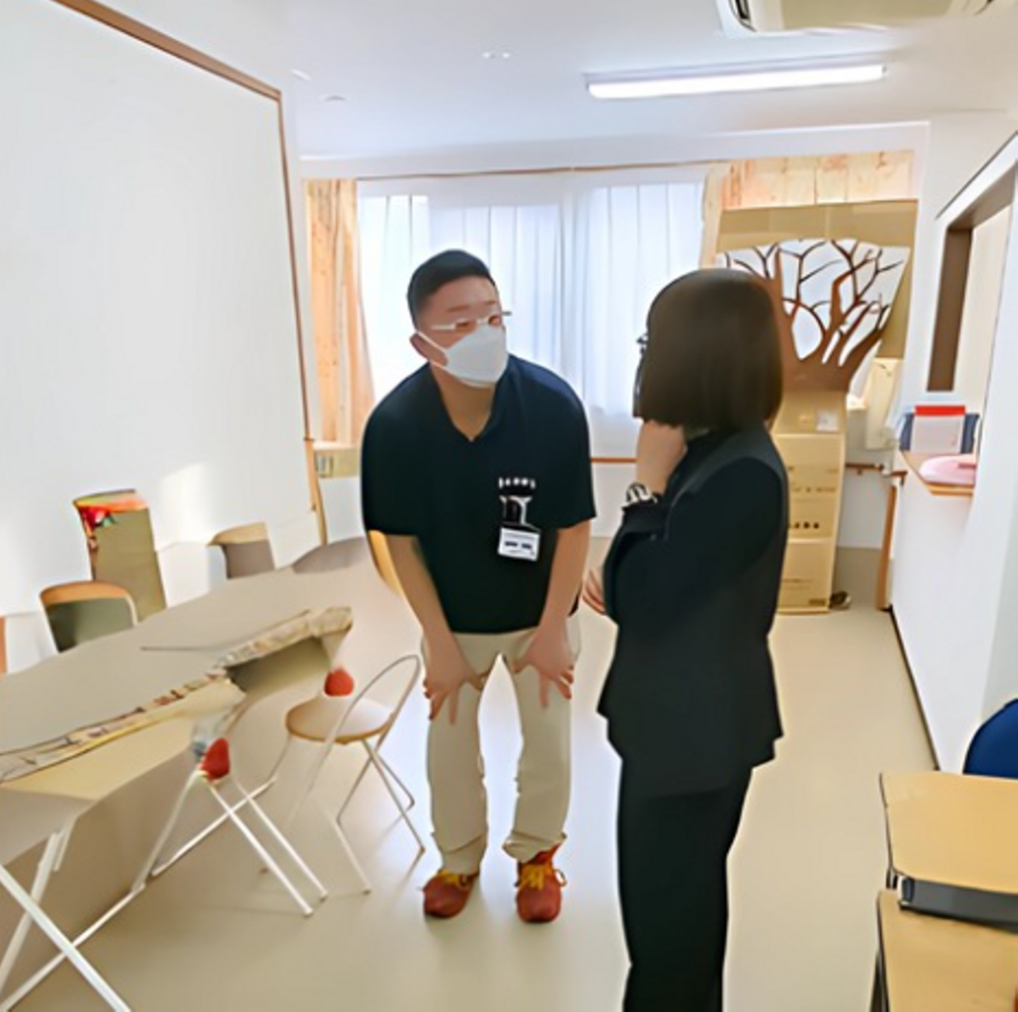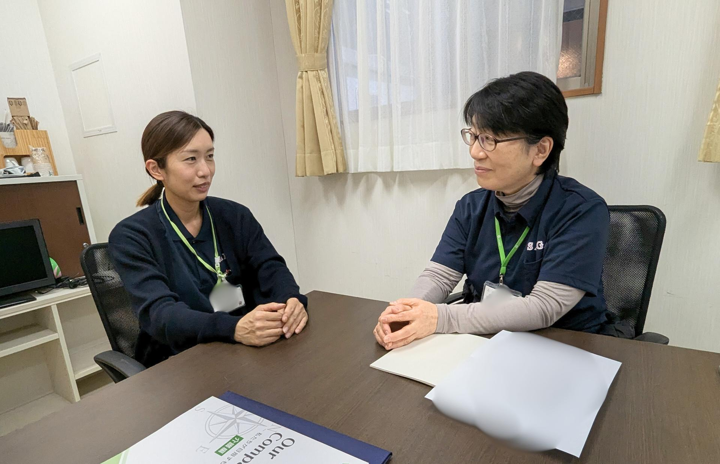 ☝施設長への尊敬の想いをお話しされる受賞者Aさん(左側)と、優しい表情でお話を聞く施設長(右側)です😊