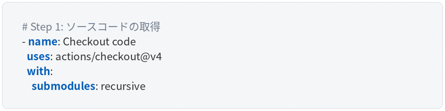 上記の Workflow を実現した GitHub Actions の YAML ファイルから、主要なステップを抜粋して紹介します。