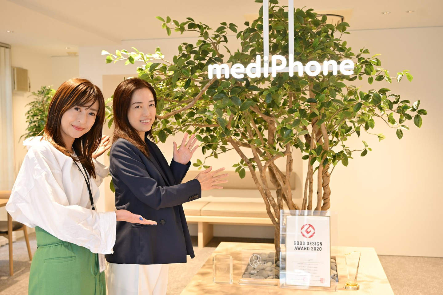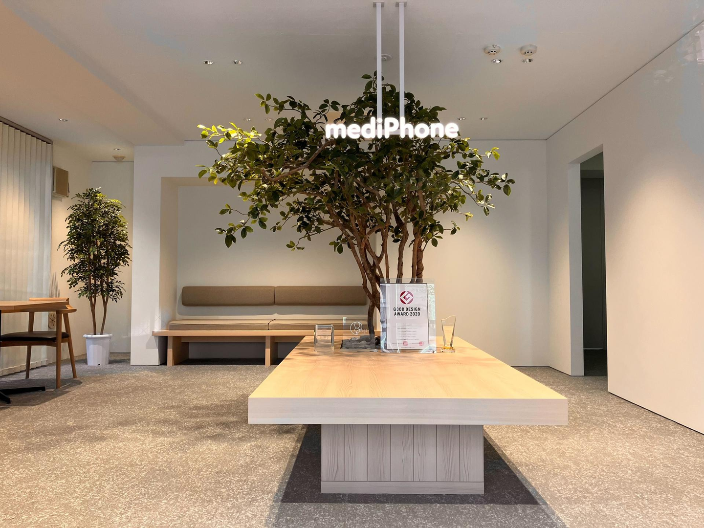 また、今回のオフィスのシンボルとして、中央には大きなグリーンが配置され、自然の温もりが感じられるデザインのレセプションエリアが挙げられます(写真参照)。この象徴的なグリーンは、社員やお越しいただいたお客様に安らぎとインスピレーションを与えてくれるように設計いたしました。メディフォンらしい温もりと想像力を感じる空間にできたのではないかと感じていますがいかがでしょうか??