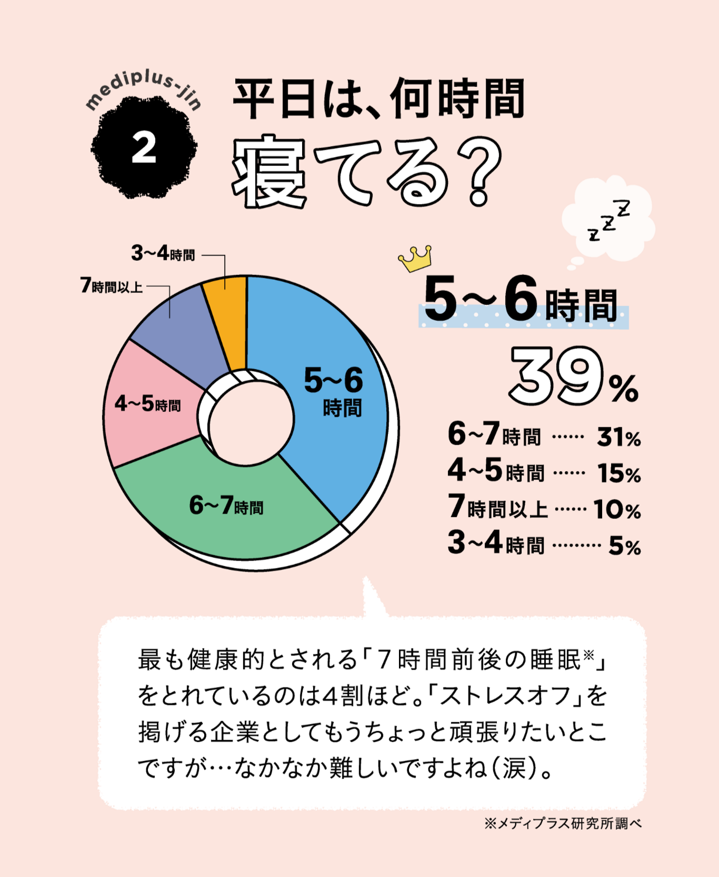 もっとも健康的※とされる「7時間前後の睡眠」がとれているのは4割ほど。