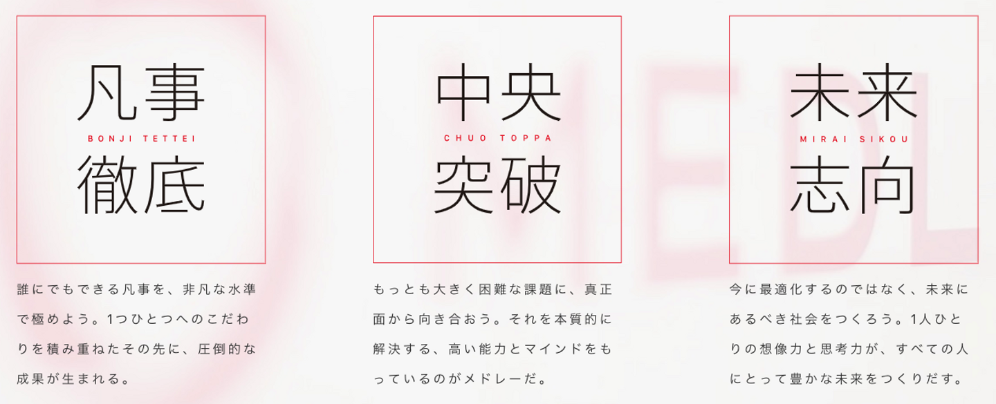 そしてメドレーには「凡事徹底」「中央突破」「未来志向」という3つのバリュー(行動規範)があります。どれも想いが深く素晴らしいものなのですが、中でも「未来志向」という言葉が一番気に入っています。