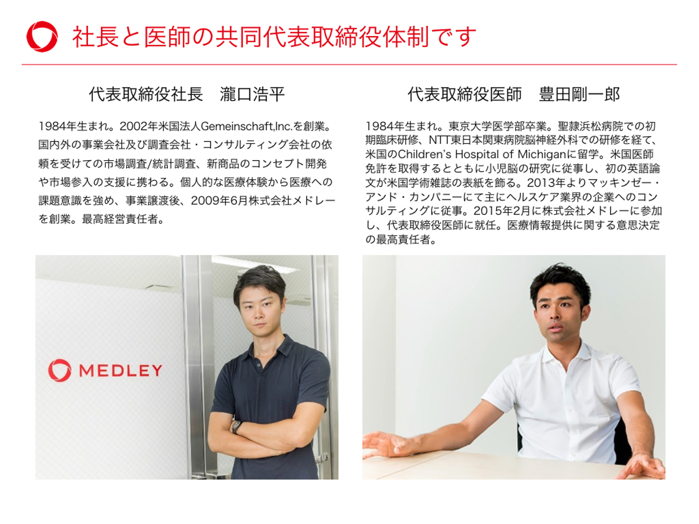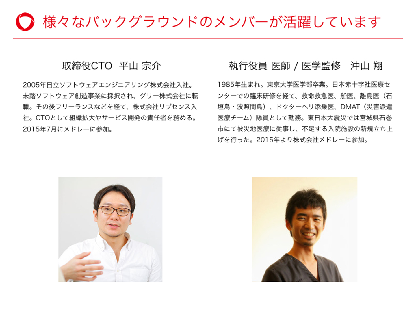 2015年には、瀧口の小学校からの友人であり医師の豊田剛一郎が加わり、共同代表体制になりました。この1年ほどでメンバーが倍増しており、現在は100名ほどが在籍しています。医師・理学療法士、薬剤師、看護師といった医療資格保持者が数多く所属しており、エンジニア・デザイナーと一緒に事業をつくり、サービスを開発しているのが特徴的です。