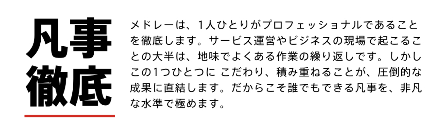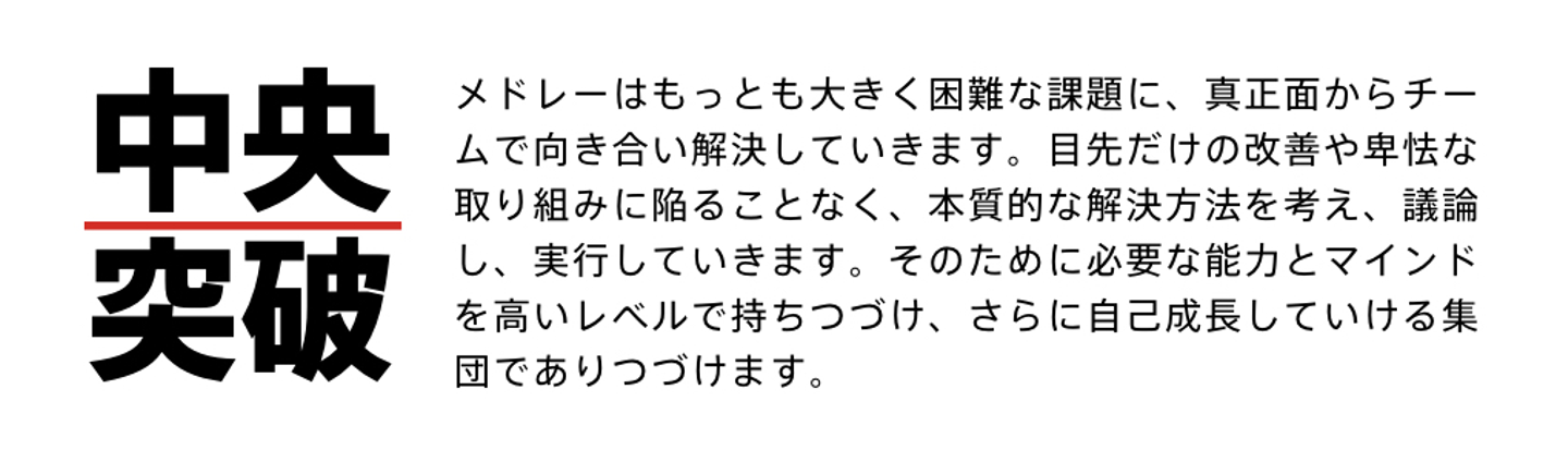 加藤:今回、メドレーでは「凡事徹底」「中央突破」「未来志向」っていう、3つの四字熟語をバリュー、行動規範にしました。この点、まずは「なんでバリューを設定したんですか?」という話と、どうやって決まっていったのか。