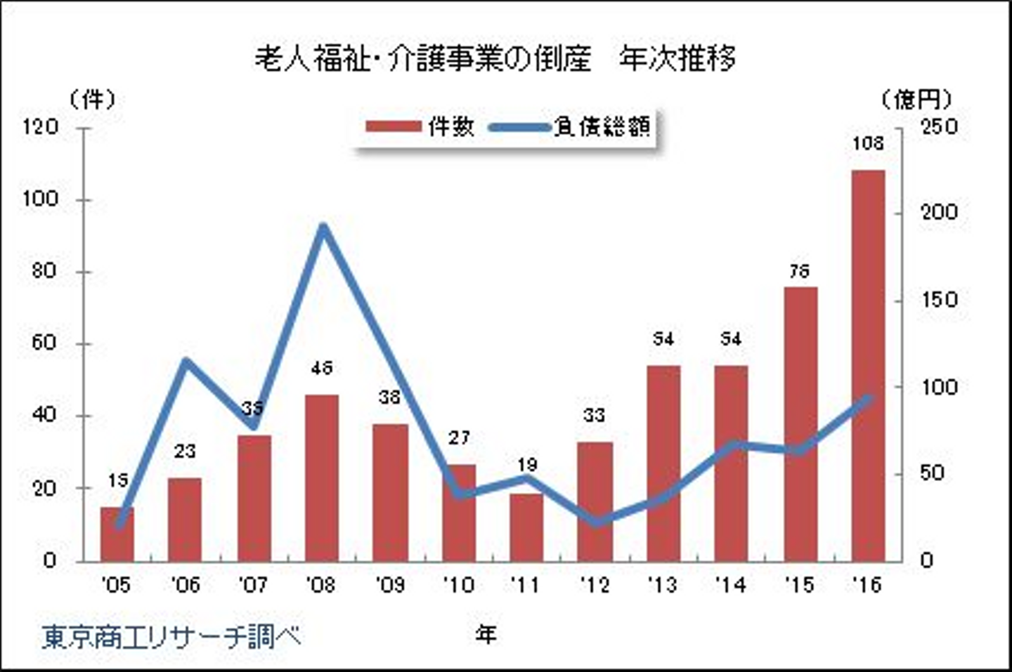 (東京商工リサーチ「2016年(1-12月)「老人福祉・介護事業」の倒産状況」より)