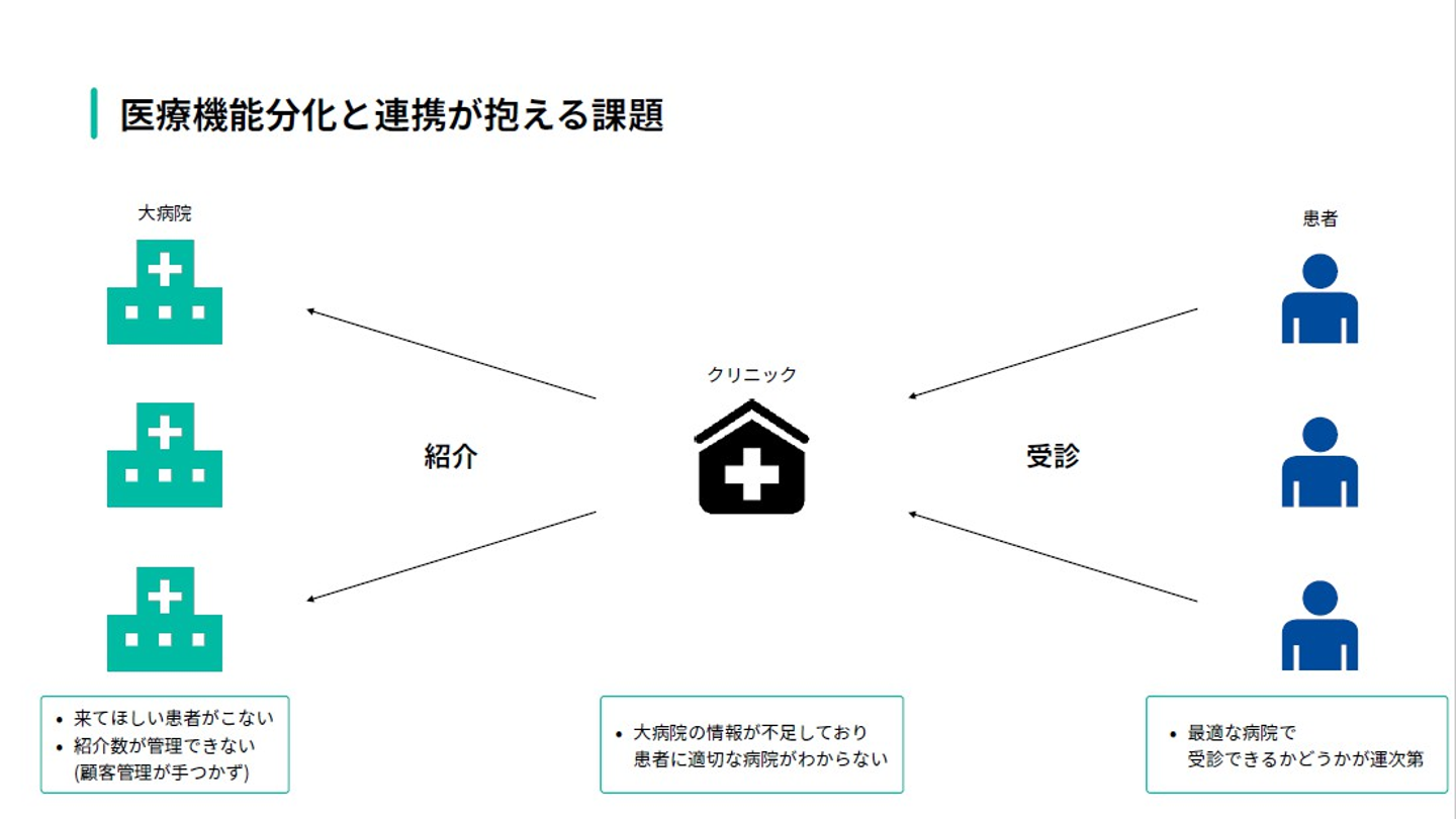 一方で、紹介を受け入れる病院側にも課題はあります。例えば、日本の4割の病院は赤字であるというデータもある通り、経営に苦しんでいる病院が数多く存在します。安定した売上を確保する手段として、訪問活動や勉強会などを通じてクリニックとの繋がりを強めて患者さんを多く紹介してもらうことが有効であると言われていて、このような地域連携を実践する病院は実際に増えてきてはいます。しかし、初めての試みのため手探りでやっているケースが大半で、効果的な施策を打ち出していくことに頭を悩ませています。