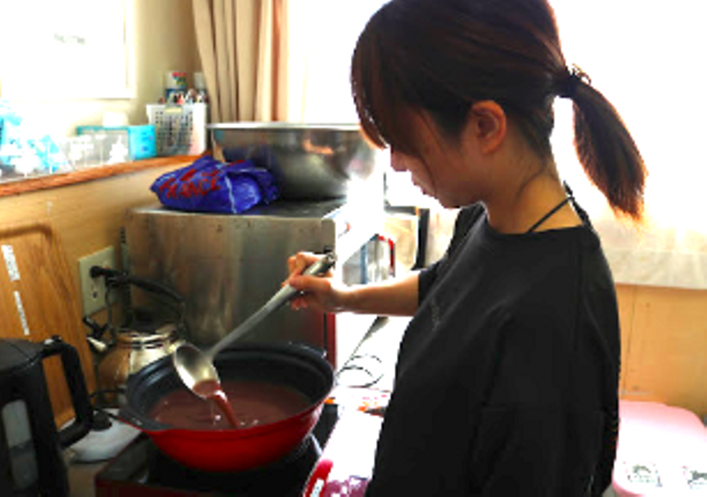 一方、フロアのキッチンでは管理栄養士兼介護スタッフのみさきちゃんが冷やしぜんざいの準備をせっせと作っています。