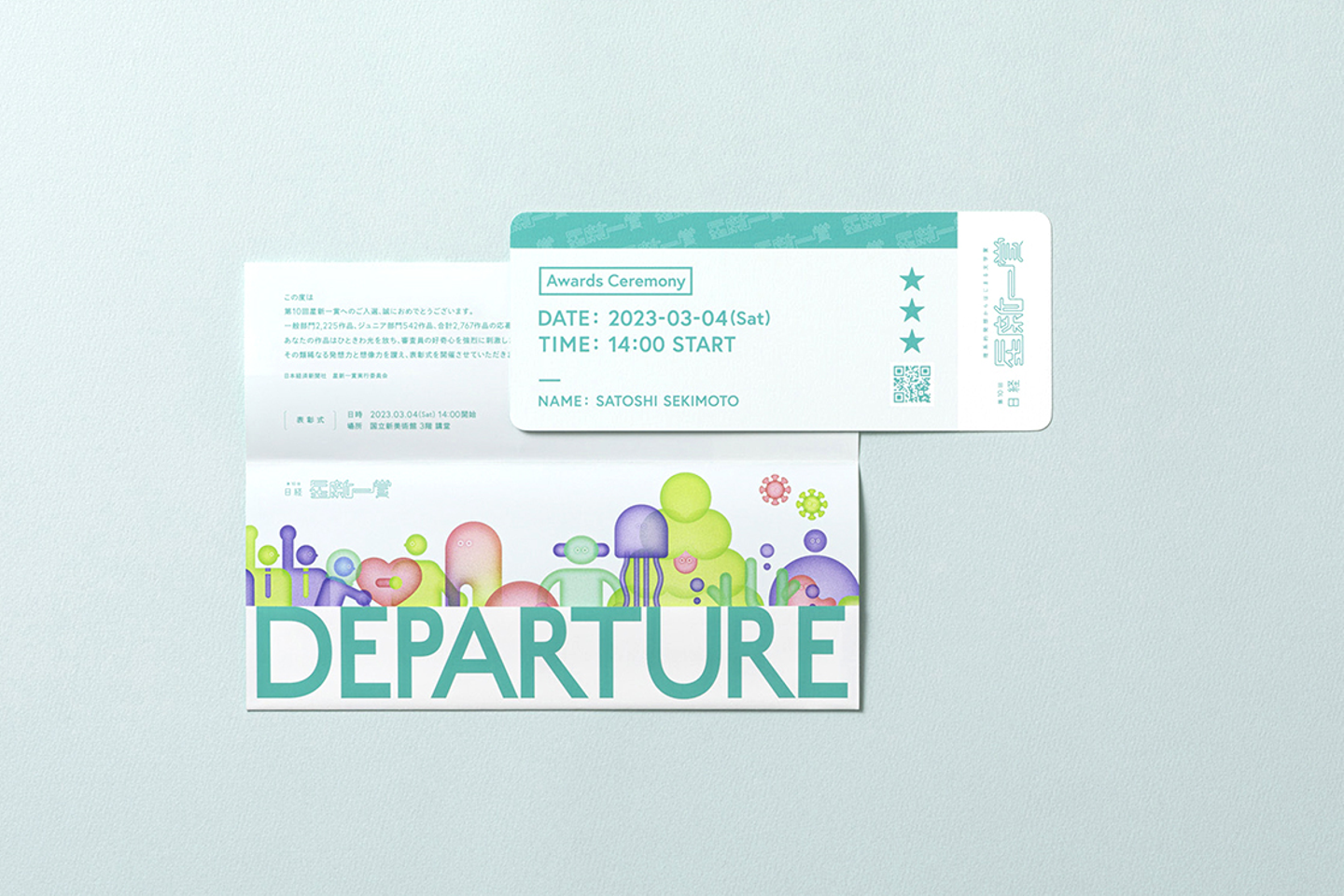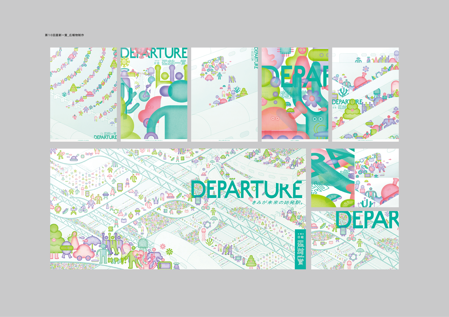後藤:ありがとうございます、、!受賞した作品は"Departures to Countless Futures"というタイトルで、星新一賞の記念すべき第十回のデザインです。このフレーズは、未来への無限の可能性を探求し、創造力を駆使して新しい物語を紡ぎ出すことを奨励する意味を持っています。過去10年間の受賞作品をグラフィックアイコン化し、異なる未来への旅に出発する乗客として表現しています。