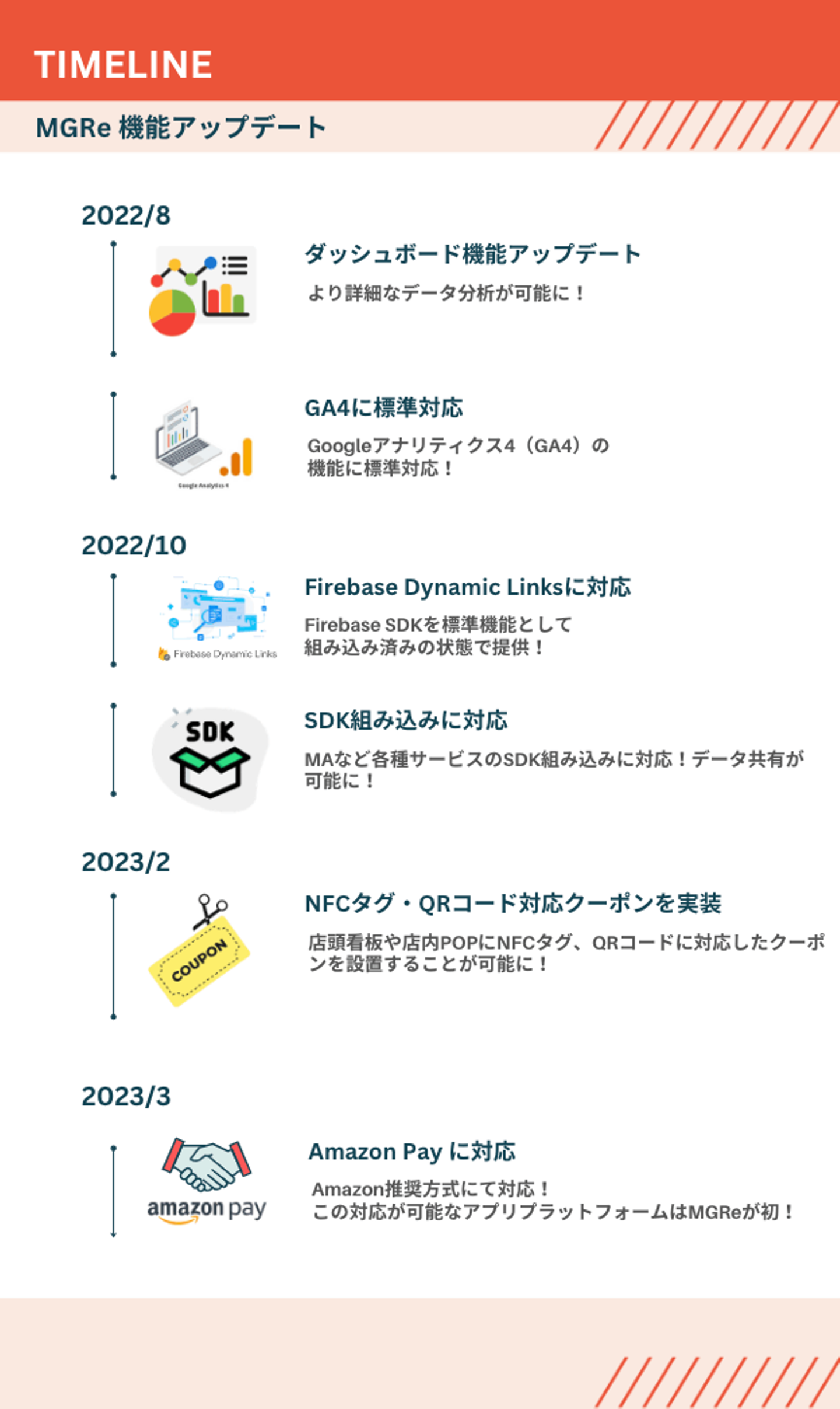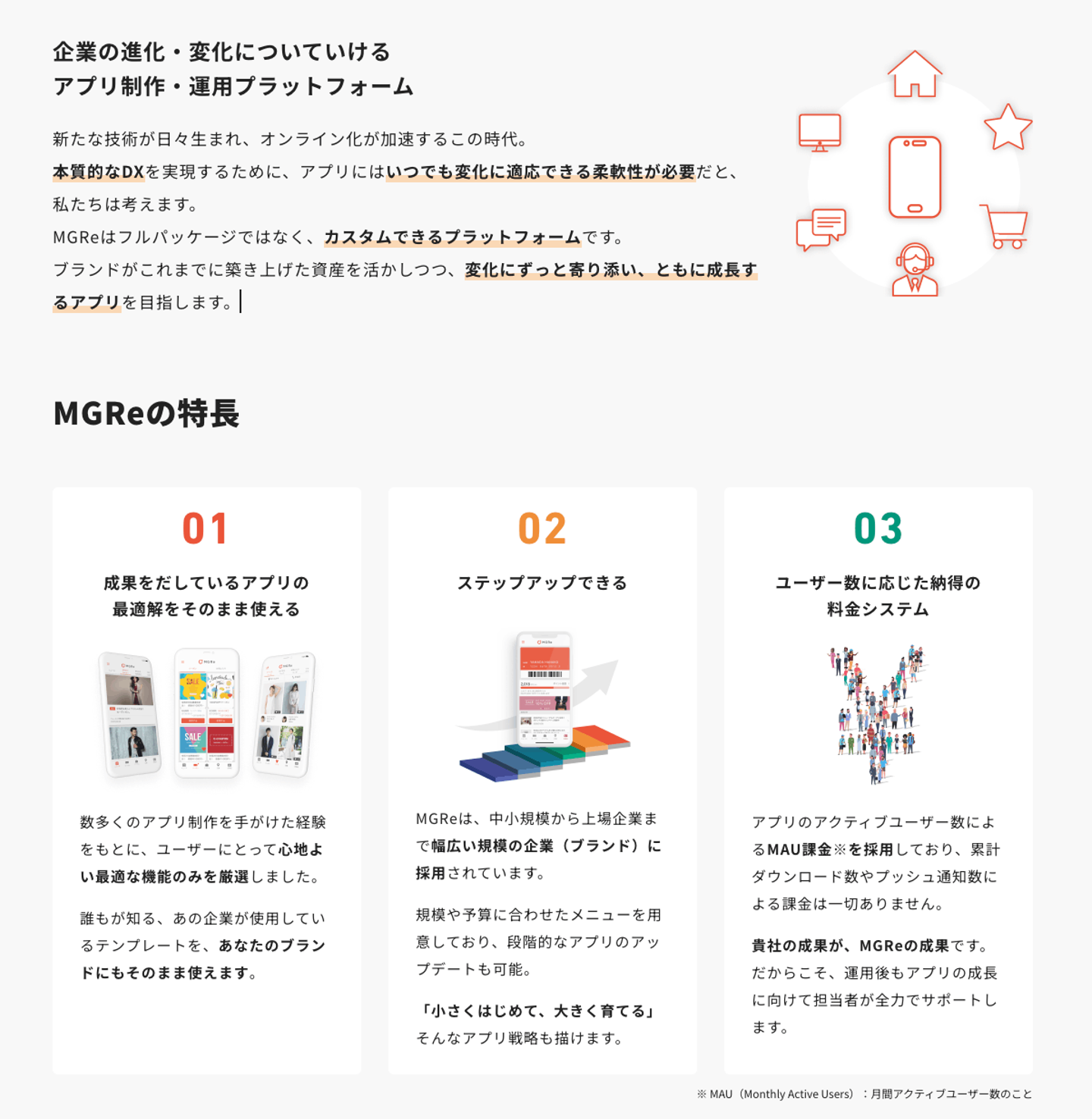 私たちは、”企業と顧客のより良い関係を支える”をミッションに、OMO(Online Merges with Offline)を実践していきたいメーカーや小売業に対して、SaaS型アプリマーケティングプラットフォーム「MGRe(メグリ)」を提供しています。モバイルアプリ開発を手軽に始めることができるサービスで、その後の運用や売上成果に繋がるマーケティング活動までサポートしています。