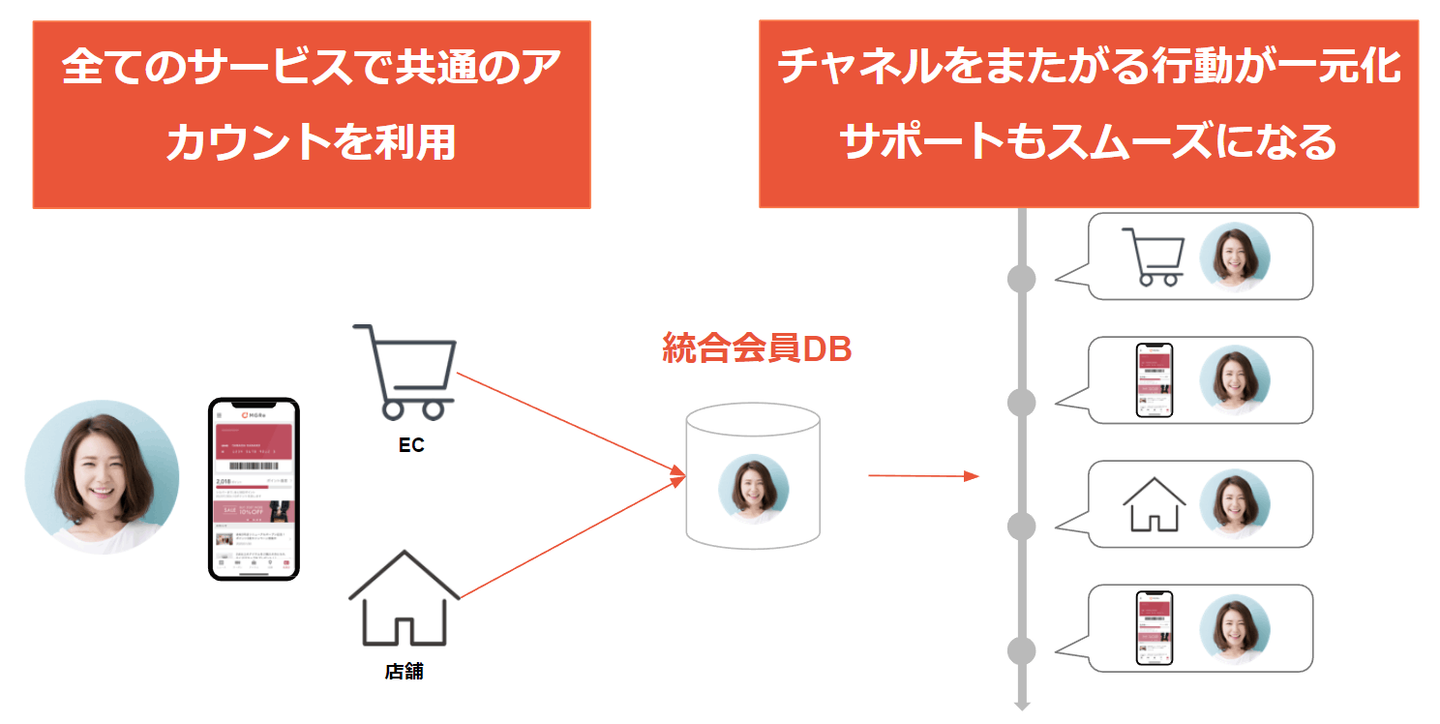 すべてのチャネル(サービス)で共通のアカウントをお客様にご利用いただくことで、チャネルをまたいだ顧客行動が一元管理できるように。結果、お客様にスムーズなサポートを提供することができます。