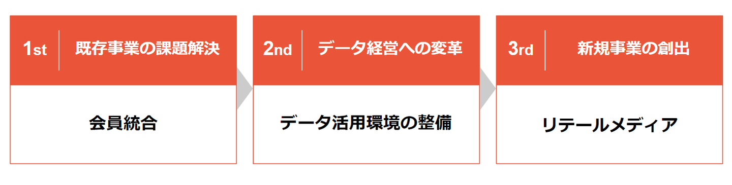 既存事業の課題を解決するという観点において、「会員統合」を実施し、お客様の情報を一元管理できる仕組みはとても重要です。データ経営での変革では、経営者だけではなく、すべての従業員がデータを活用できる環境を整備していく必要があります。そして、ファーストステップとセカンドステップを経て、リテールメディアを活用した新規事業の創出が可能となるのです。