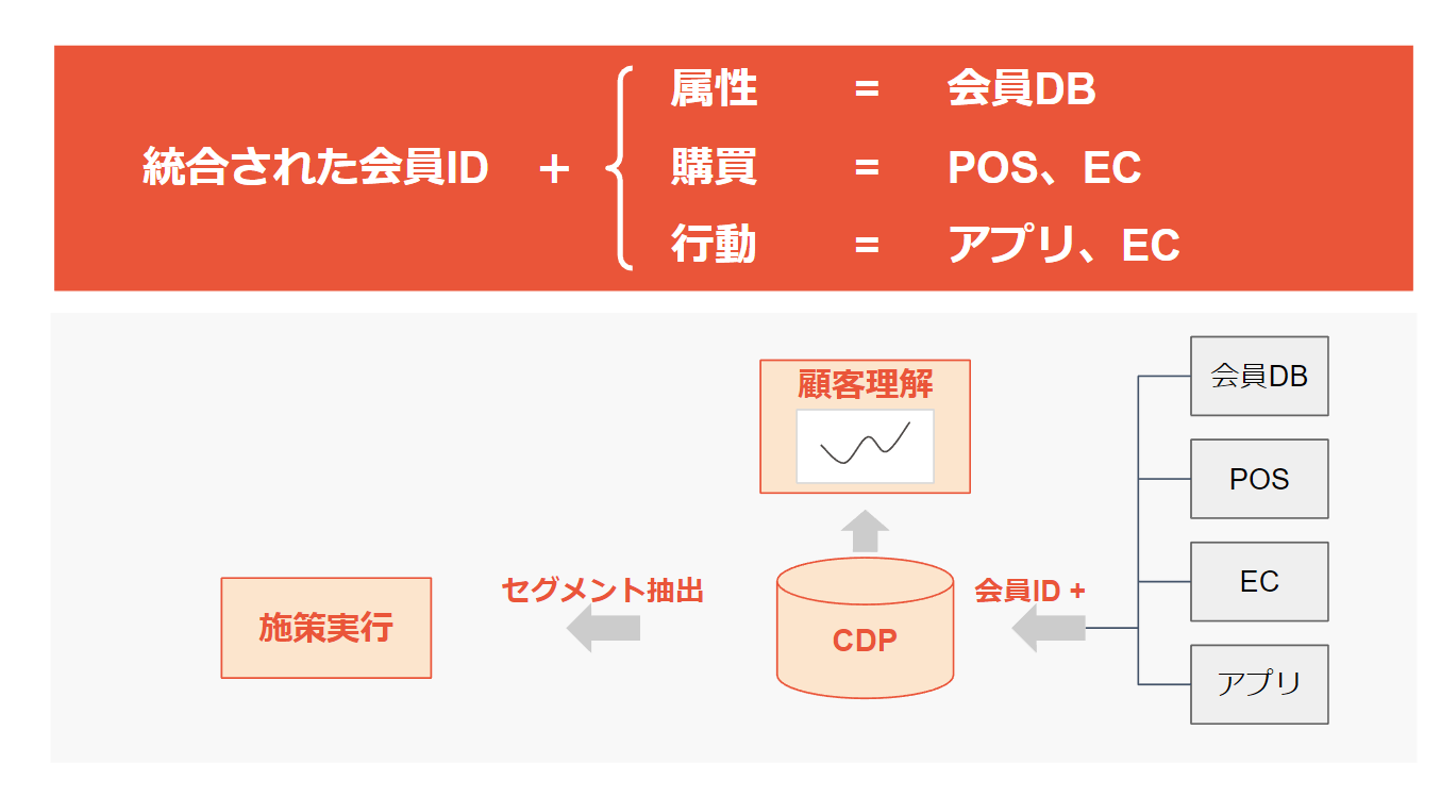 上記ふたつを実現させるためには、統合会員データベースに紐づく会員IDをカギとした、お客様の属性・購買・行動といったデータが必要です。そして、このような顧客データを一元管理する仕組みが、データ経営には必要なのです。具体的な全体イメージとして、以下の図をご覧ください。