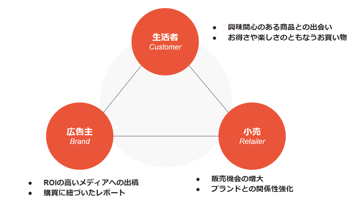 リテールメディアは、「生活者」「広告主」「小売」の三方どちらにもメリットを生み出せる特徴があります。