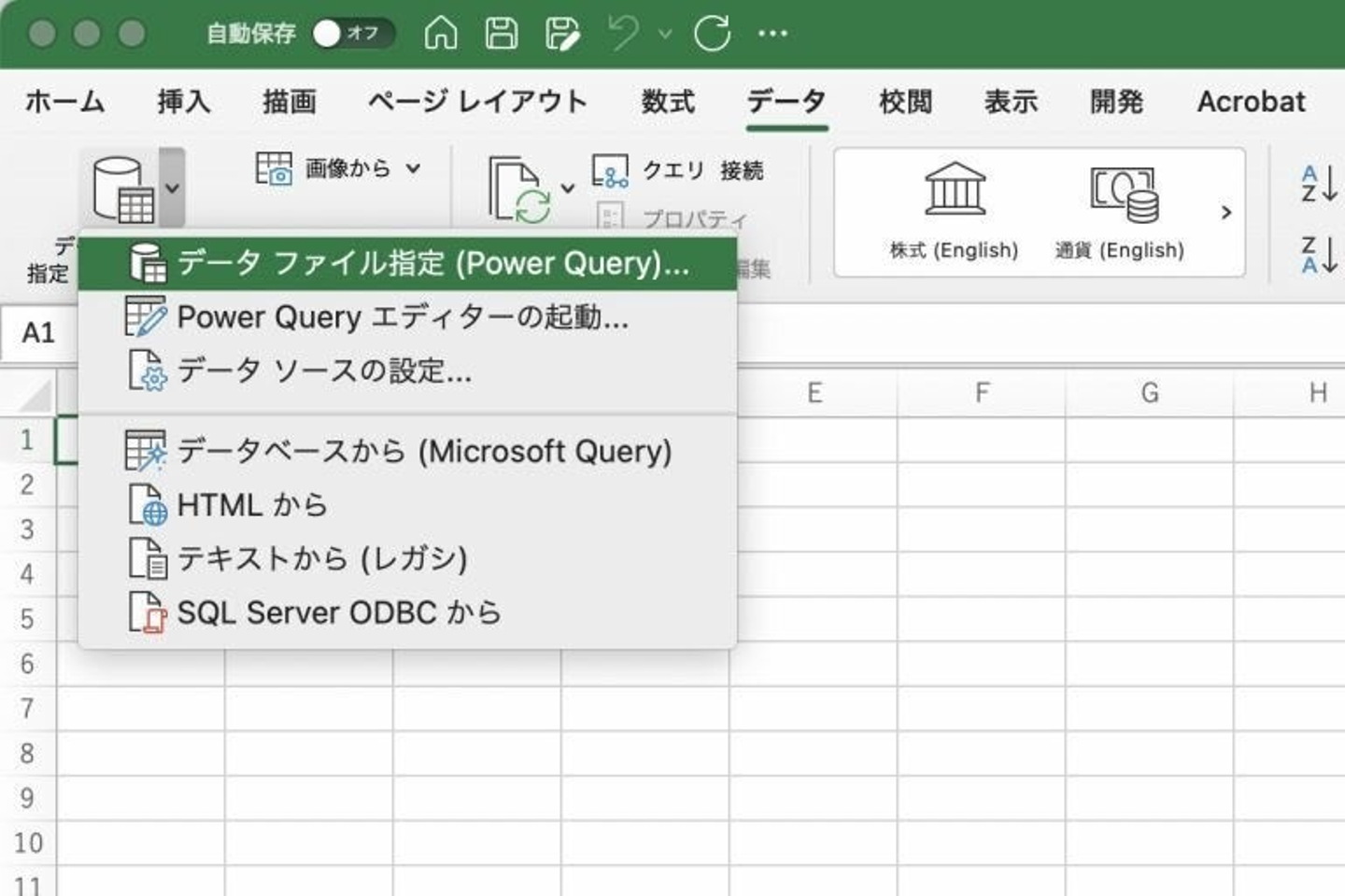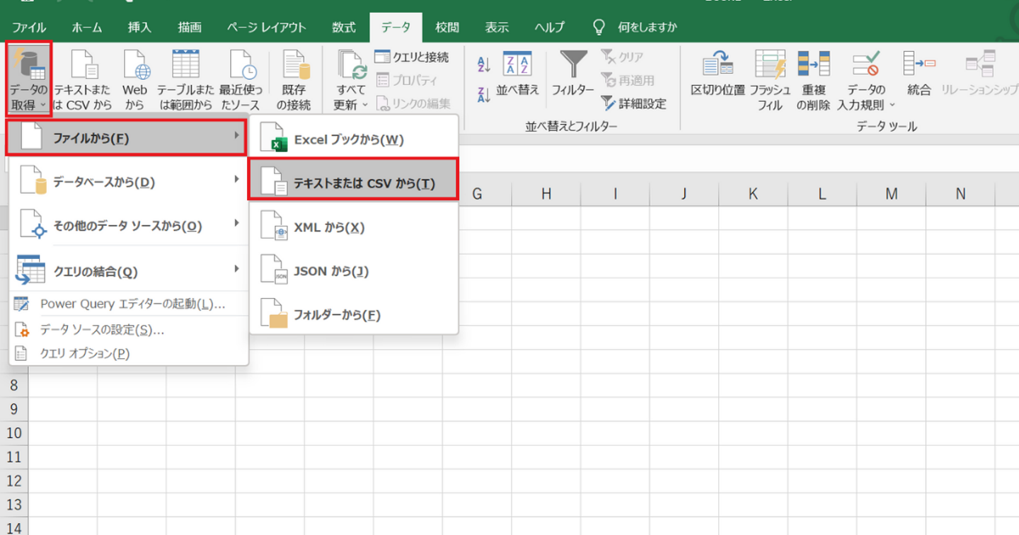 新規でブックを作成し、リボンの「データ」からデータファイル指定(Power Query)を選択します。