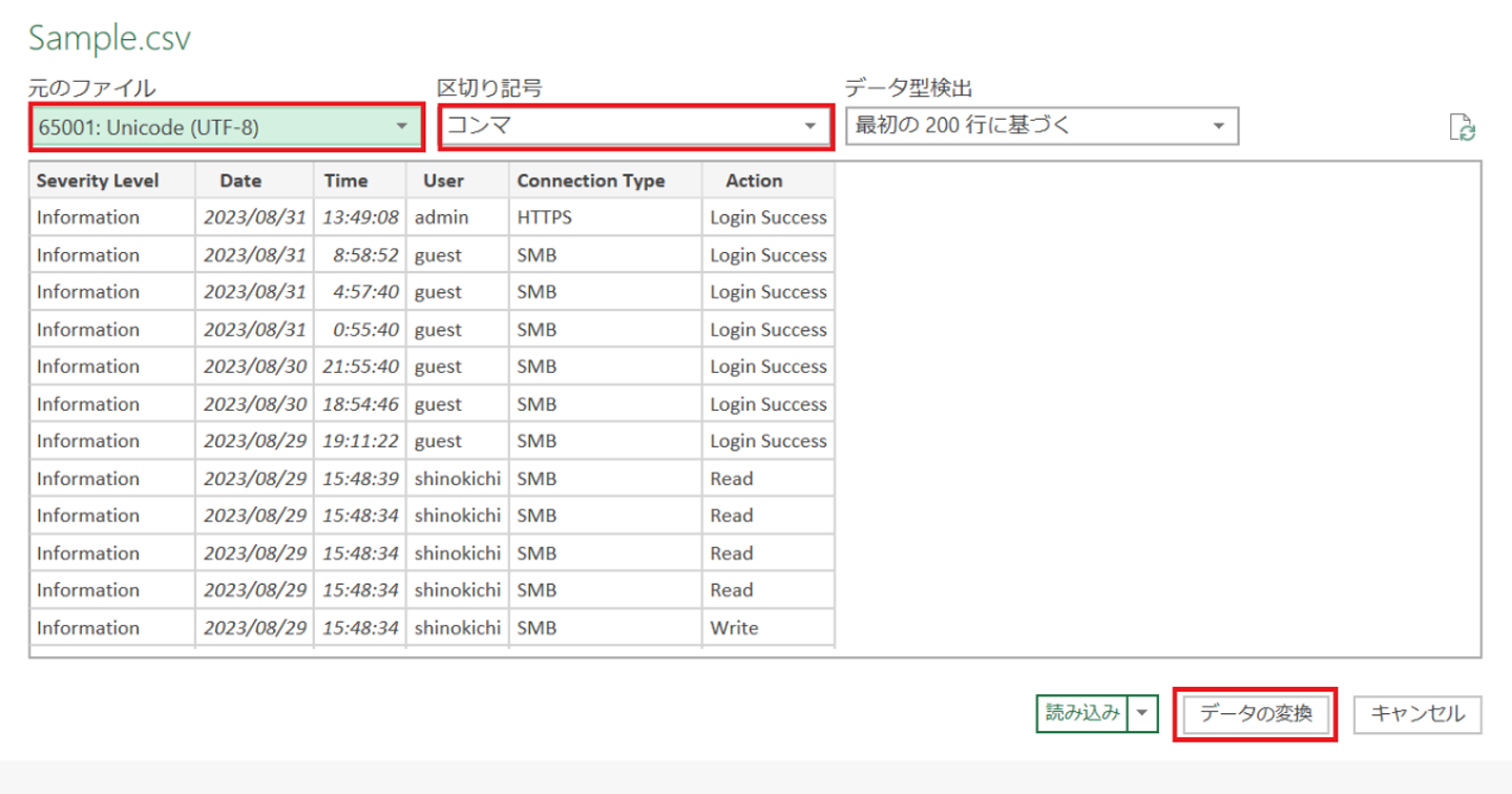 読み込ませたいCSVファイルをインポートしたら、元のファイル形式「UTF-8」、区切り記号「コンマ」を選択し「データの変換」をクリックします。