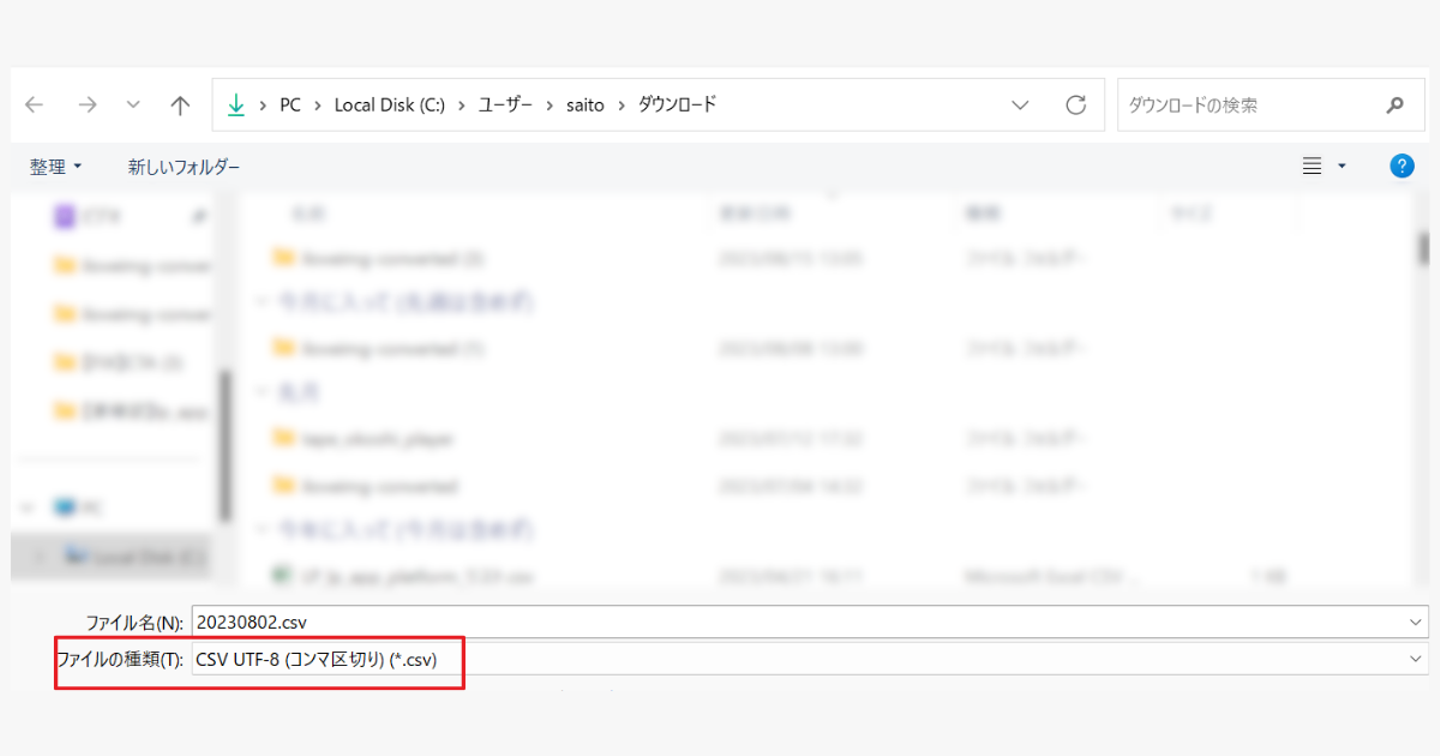 また、開いたCSVファイルをExcelからさらに保存したりエクスポートをしたりする時にも注意が必要です。保存の文字コードをきちんとUTF-8にしないと、今度はファイルの受け入れ側で文字化け等が発生する可能性があります。これを防ぐために、「CSV UTF-8(カンマ区切り)」という保存形式を選んでください。