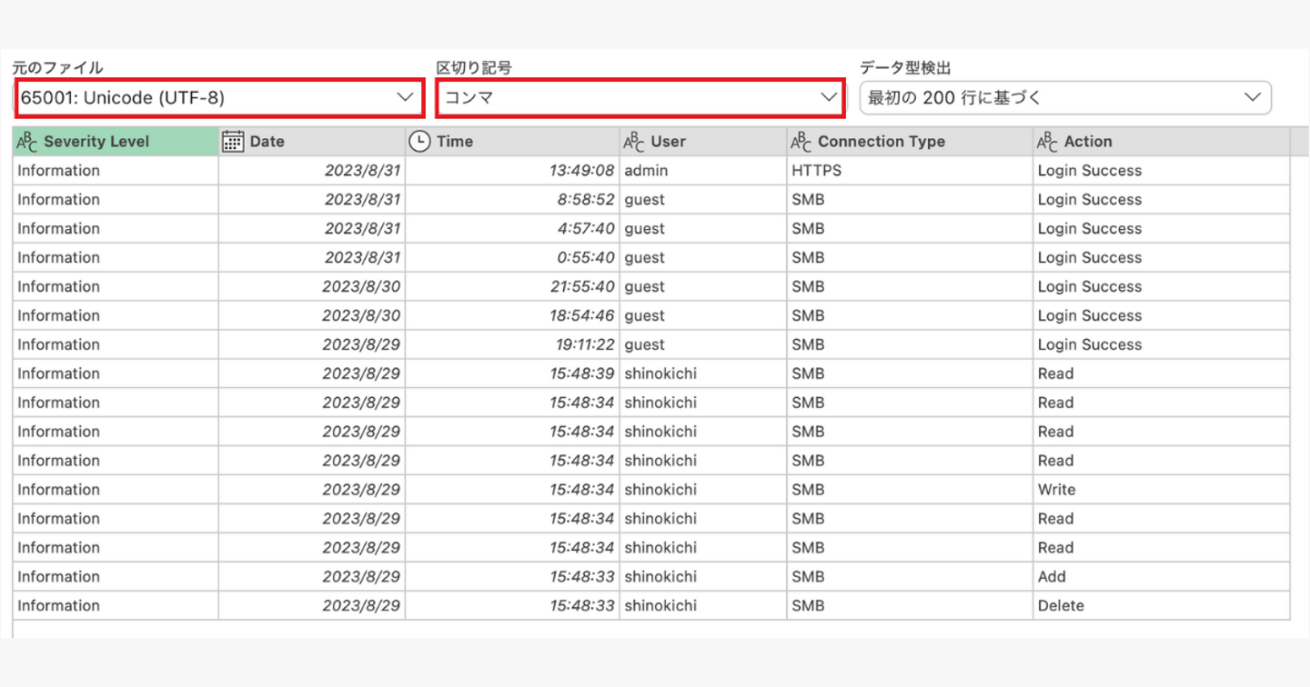次に、元のファイルを「UTF-8」、区切り文字を「コンマ」に指定します。下にある表は、「これは日付のデータだよ」「これは時間のデータだよ」などを細かく指定したものになります。見ていただければ分かる通り、1列ごとに細かく指定することが可能です。