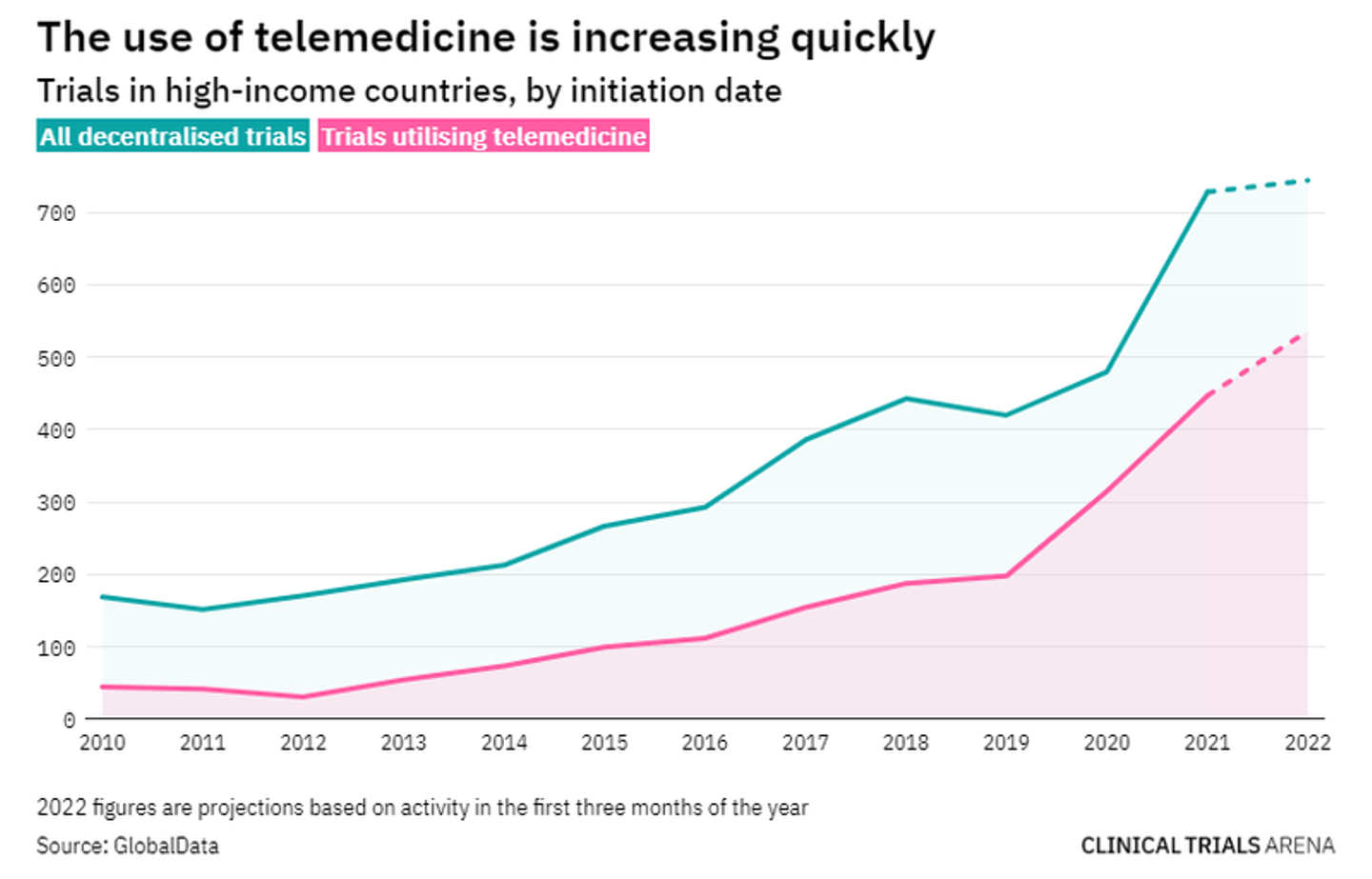 海外の治験プロセスのデジタル化は、コロナのパンデミックで大きく進みました。下の図のように、治験でのオンライン診療の導入も増えています。コロナが蔓延している中で治験のためにわざわざ病院に来たくない患者さんのニーズと、デジタルツールを普及させ治験の効率化を図りたい製薬企業のニーズが合致したからです。正直、医療現場にはデジタル化に伴う負担増のしわ寄せも来ているらしく、海外の事例がベストかといわれると、難しいところもありますが。