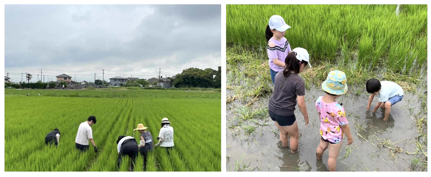 5〜7月の草むしりは、稲を健康にしっかり育てるため欠かせない作業です。作業前に農園の方に、どの雑草を刈るのか、どのような草が生えてるかなどのレクチャーを受けて草むしりスタート!田植え同様に、素足で畑に入りますよ^^
